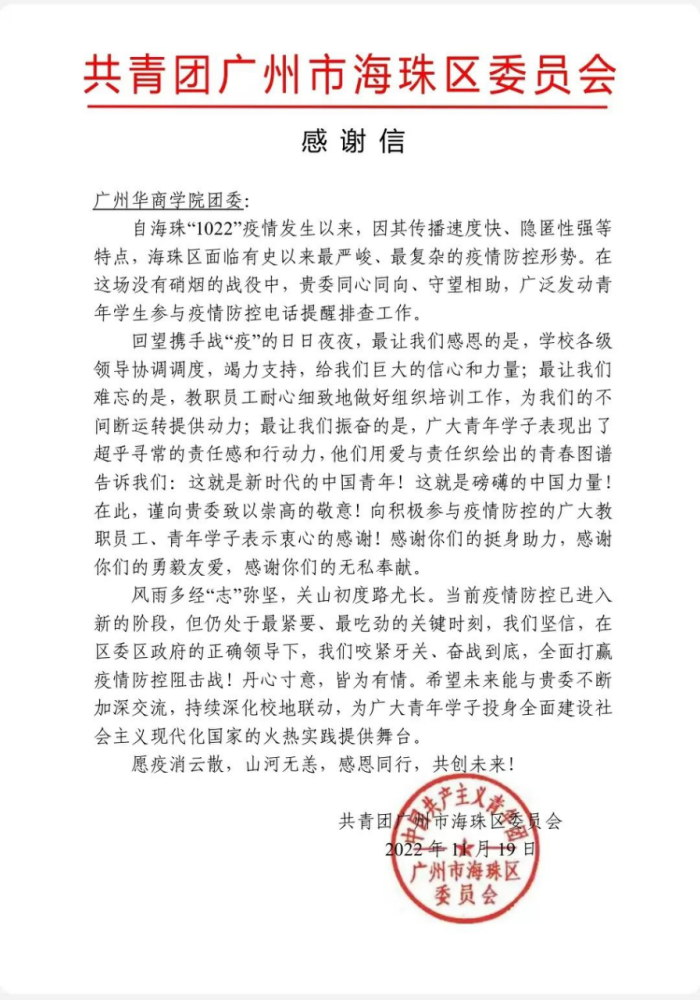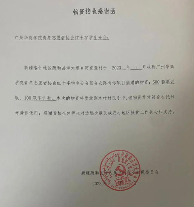 在学校党委的领导下,学校团委始终坚持引领华商青年学子深入学习贯彻习近平新时代中国特色社会主义思想,积极培育和践行社会主义核心价值观大力弘扬志愿精神,丰富志愿服务形式,在2022年交上华商青年答卷。岁末年初,暖冬寄温情。近日,我校团委收到了两份分别来自共青团广州市海珠区委员会以及新疆喀什地区疏勒县洋大曼乡阿克亚村的感谢信。