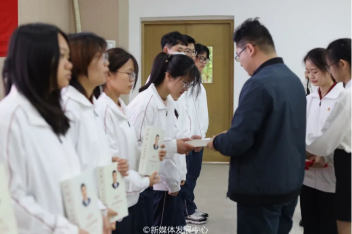 四会校区党委委员、管委会副主任、学校教务处段晓聪副处长向各学院入团积极分子代表赠送书籍。