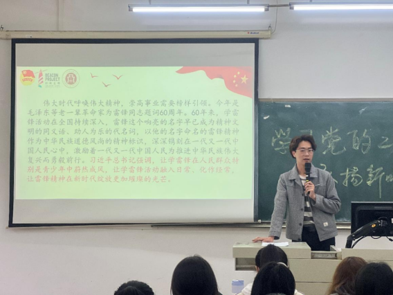 3月,国际学院团委在启智楼405组织开展深入学习习近平总书记关于深入开展学雷锋活动的重要指示精神专题学习会,学院团委书记杨李军领学。杨老师强调,每个人都学雷锋做好事,每个人都崇德向善、见贤思齐,中国式现代化的道德根基就会更加坚实,奋进力量就会更加凝聚。“雷锋精神是永恒的”“雷锋精神,人人可学;奉献爱心,处处可为”。广大青年要将学习弘扬雷锋精神同学习贯彻党的二十大精神相结合,同学习贯彻习近平总书记关于青年工作的重要思想相结合,感悟“雷锋”们身上的崇高理想和坚定信念,听党话、跟党走;感悟“积小善为大善”的道德品质,多做实事好事。