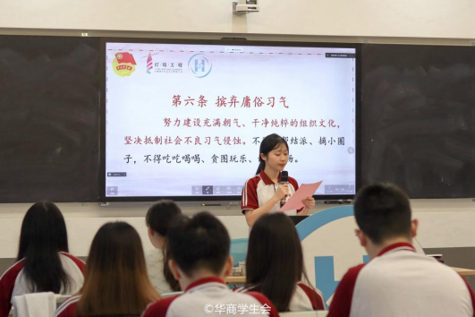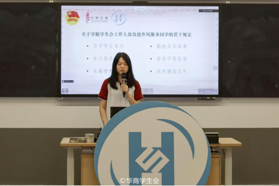 会议第二项议程,校学生会主席团成员黄朵懿领学《关于学联学生会工作人员改进作风服务同学的若干规定》。她从恪守学生本分、牢记服务宗旨、永葆理想情怀、勤勉务实做事、营造平等氛围、摈弃庸俗习气六方面展开,联系青年学生群体普遍特点,以“青年与青年对话”的形式,明确学生骨干的使命与责任,提出工作人员应严于律己、争当表率,共同打造有秩序、有温情、有成效的学生会组织。