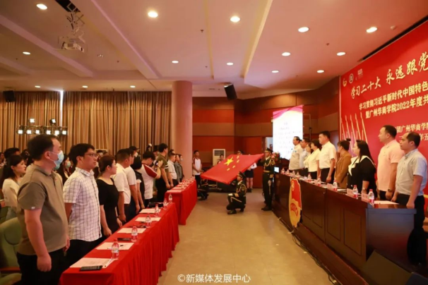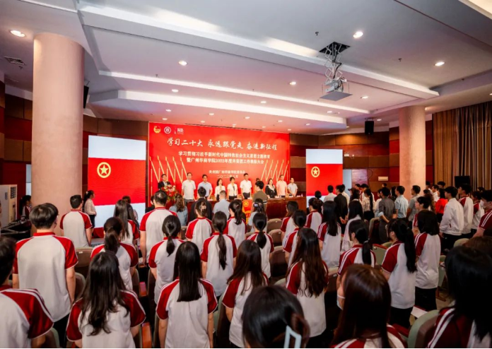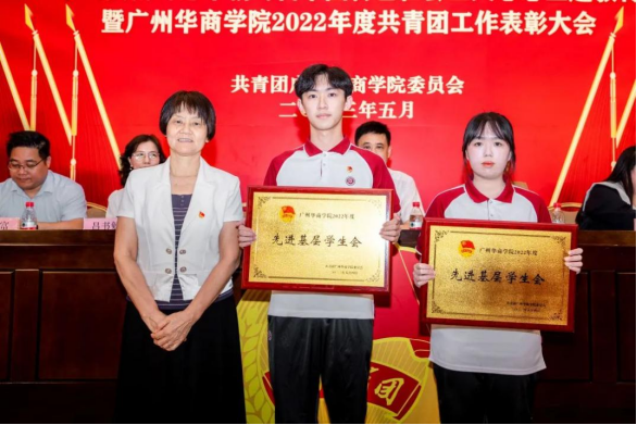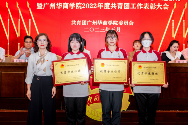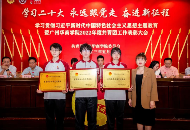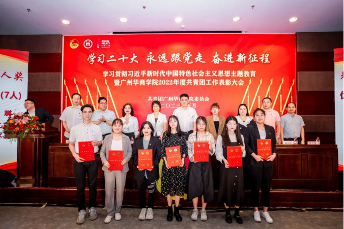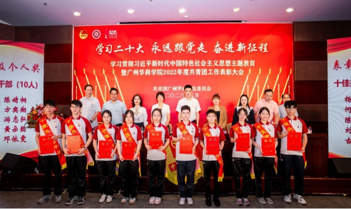 为深入学习贯彻党的二十大精神,全面领会习近平总书记关于青年工作的重要思想,引导广大华商青年厚植家国情怀、涵养进取品格,以习近平新时代中国特色社会主义思想凝心铸魂,用奋斗姿态激扬青春,不负时代、不负韶华,努力成长为有理想、敢担当、能吃苦、肯奋斗的新时代好青年。在学校党委领导下,校团委在国际会议中心4楼报告厅举行“学习二十大,永远跟党走,奋进新征程”学习贯彻习近平新时代中国特色社会主义思想主题教育暨广州华商学院2022年度共青团工作表彰大会。本次表彰大会采取线上和线下相结合的方式,增城校区设主会场,四会校区设立分会场。大会由校团委陈刚书记主持。