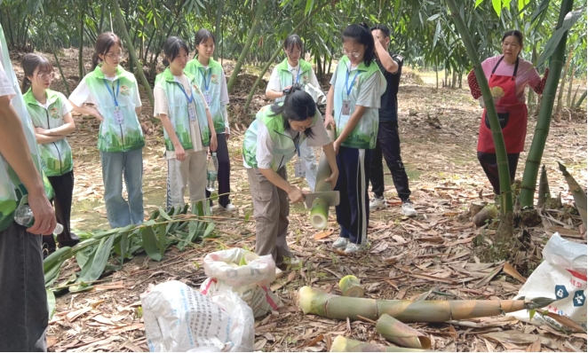 7月5日,团队来到西牛镇麻竹笋种植园,队员们认真观摩农民砍伐竹笋的过程,也亲身体验了采摘砍伐和剥皮的流程。紧接着,我们前往西牛镇电商创业园,采访创业园的经理并与经理协商在后续借助该产品网络直播带货,进一步宣传并推广当地特色农产品,扩大农产品知名度和英德乡镇的影响力,促进英德乡村发展更加繁荣。