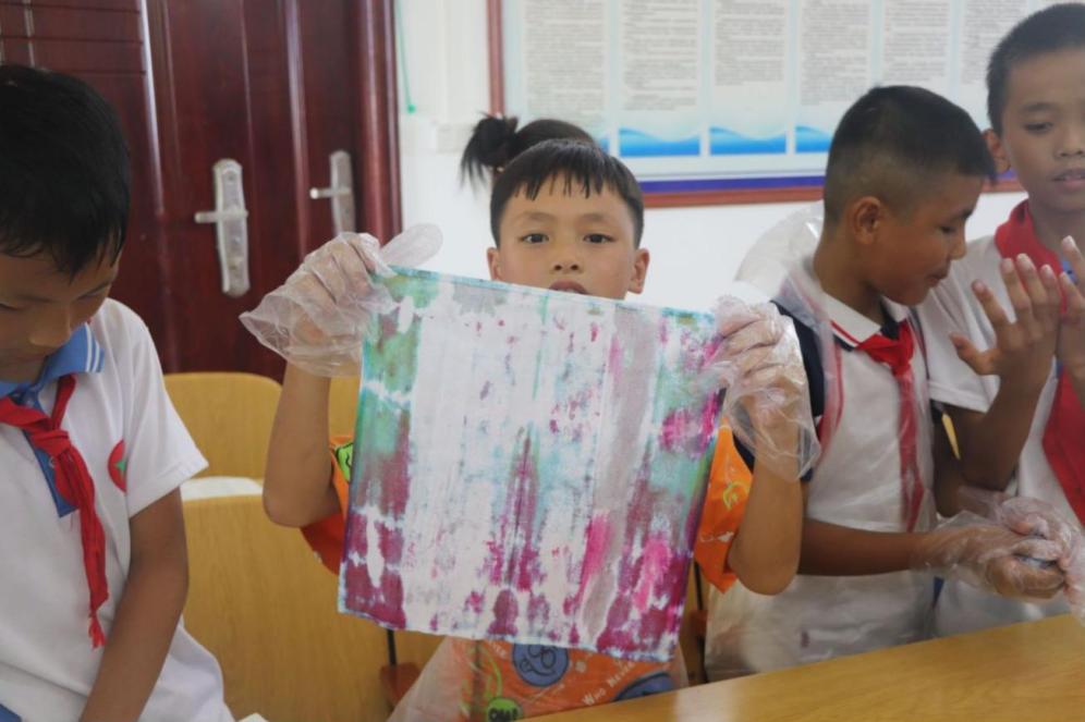 扎染是中国民间传统而独特的染色工艺,在我国已有数千年的历史,不仅制作工艺有趣,还具有独特的艺术风格。为传承该文化,实践队队员开展了《非遗文化-扎染》系列课程。7月13日,实践队队员用理论课与实践课相结合的教学方式,通过讲解扎染的起源与制作工艺,学生充分了解到扎染文化发展历史,增加学生对传统手工艺的认识,同时在实践动手过程中,不断探索理论与实践之间的联系,体验到非遗文化的乐趣。