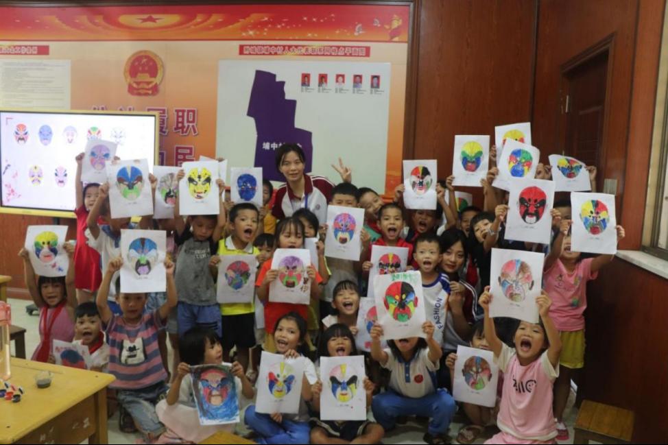 在雷剧文化中,实践队队员以理论与实践结合的教学方式,先让学生了解雷剧的起源与脸谱的制作工艺的理论知识,增加学生对脸谱的认识,再进行实践动手,让学生亲身体验到雷剧的乐趣。在上课期间,实践队队员积极引导学生使用普通话与老师同学交流,并且队员在交流过程中纠正学生普通话发音不准问题,一定程度上提高了学生普通话水平。