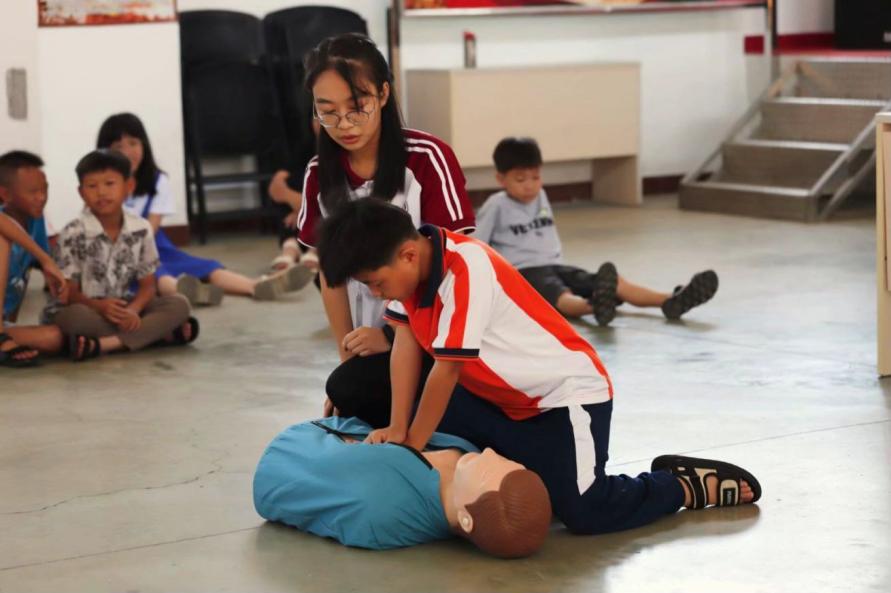7月6日上午,第一二节课是急救实践课。团队志愿者陈佳瑶和张瑞运用视频展示、实践操作等方式,让同学们了解黄金4分钟的重要性。同时现场演示心肺复苏法、海姆立克急救法以及三种绷带包扎的处理方法,增强了学生的自救、互救意识。第三节课是“自信在我心”的心理小课堂。李晨老师先让同学们在闪光卡上写出自己的各项优点、特长或进步,使学生充分认识到自己的优点和特长,增加了同学们的自信心,然后让同学们相互寻找他人身上的闪光点,使学生学会发现他人的闪光点,学会相互鼓励对方。第四节课是“情绪之主人”的心理小课堂。李晨老师先以自身为例,引导学生表达自己的情绪,再通过猜测对方表情的方式,让孩子们感受生活中不同情景中的各种情绪的存在是正常的,提高了同学们的心理调节能力。下午,第一节课是语言系列小课堂。为推动当地普通话普及程度,助力乡村振兴。广州华商学院“青衿萤火”社会实践队设计语言系列小课堂。课程采用“教学+比赛”的形式开展。在课堂上,曹丽丽老师教授了朗诵的技巧和方法,后期将通过朗诵比赛的形式,让学生们在实践中加深朗诵的理解与掌握,助力推广普通话。第二三节课是劳动教育课。团队志愿者带领学生对教室、礼堂、足球场等地方进行了劳动,目的是培养同学们良好的劳动意识和劳动习惯。晚上,“青衿萤火”社会实践队全体到达墙绘地点,进行了“领略蓝康精神”的墙绘实践,团队志愿者们将墙绘的全部图案全部描绘了出来。