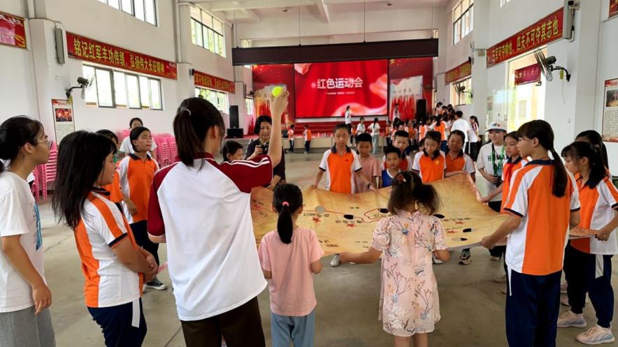 下午,为赓续红色传统,传承红色基因,广州华商学院“青衿萤火”社会实践队通过前期周密的策划设计和精心筹备了以“红色精神润童心 强身健体向未来”主题的首届红色趣味运动会,设置了重走长征路、飞夺泸定桥等红色游戏。活动开展前,团队志愿者古晓详细安排了人员安排以及对工作人员进行活动流程彩排。彩排结束后,随着主持人慷慨激昂的报幕声,红色趣味运动会正式开始,同学们非常积极热情,在游戏过程中重温抗战时期的光辉历史和英雄壮举,以实际行动追寻英雄足迹、体验革命精神。晚上,“青衿萤火”社会实践队全体到达墙绘地点,进行了“领略蓝康精神”的墙绘实践,团队志愿者邓清、杨颖和邹吴海帆给每个人分配好任务,初步将墙绘的部分图案的轮廓用粉笔描绘了出来。