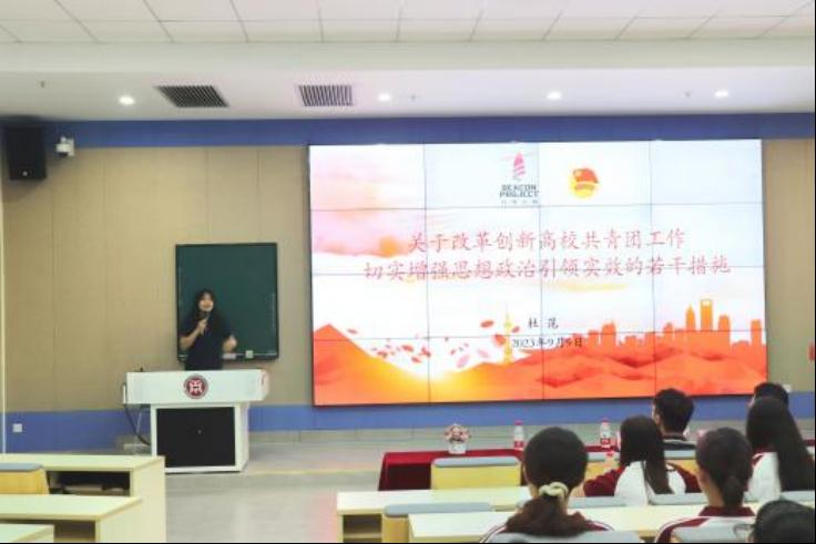 为认真学习习近平总书记在同团中央新一届领导班子集体谈话时的重要讲话精神,加强青年学生的思想教育,厚植爱党、爱国、爱社会主义的情感。9月,管理学院团委面向双校区青年团员开展“学习习近平总书记同团中央新一届领导班子成员集体谈话时的重要讲话精神”主题团课。团委书记徐煜忻号召管理学院的团员青年要在日常生活中刻苦学习、积极进取,坚定理想信念、培育高尚品格、练就过硬本领、勇于创新创造、矢志艰苦奋斗,毫不动摇地听党话跟党走。罗玉凤副书记强调同学们要认真深刻领会其中的丰富内涵和精神实质,旗帜鲜明讲政治,不断提高政治判断力、政治领悟力、政治执行力,以青春奋斗姿态挺膺担当。学院团委副书记魏巍指出,在全面贯彻落实党的二十大精神开局之年,习近平总书记对共青团工作发表重要讲话,有重大深远的战略考量,同学们要始终走在坚定拥护“两个确立”、坚决做到“两个维护”的前列,立志做有理想、敢担当、能吃苦、肯奋斗的新时代好青年。