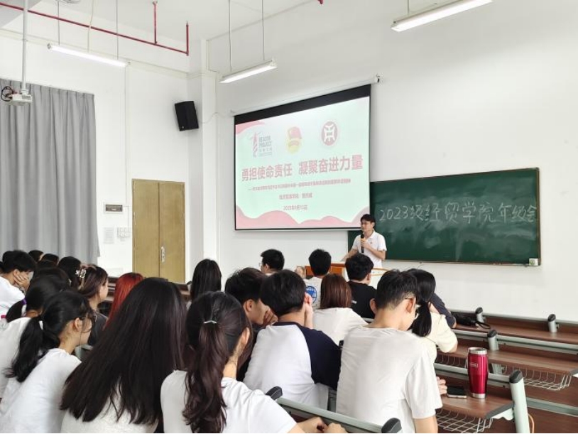 9月13日,经济贸易学院在四会校区6号楼304组织召开学习习近平总书记在同团中央新一届领导班子集体谈话时的重要讲话精神主题团课。本次会议“勇担使命责任,凝聚奋进力量”主题,学习宣传贯彻习近平总书记同团中央新一届领导班子集体谈话时的重要讲话精神。会上,曾庆威老师围绕新时代中国青年运动和青年工作的主题为大家展开经济贸易学院新学期工作做相关工作部署和具体要求。他指出,实现强国建设、民族复兴宏伟目标,需要全党全国各族人民包括广大青年团结一致、全力以赴,继续爬坡过坎、攻坚克难。新时代青年应增强历史责任感和使命感,激发强国有我的青春激情,在强国建设、民族复兴伟业等各领域各方面工作中争当排头兵和生力军,展现青春的朝气锐气。