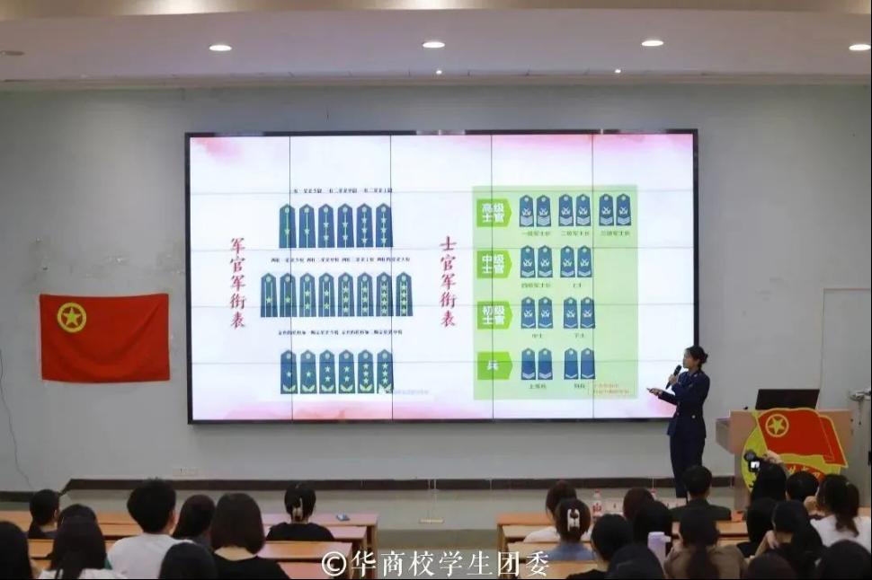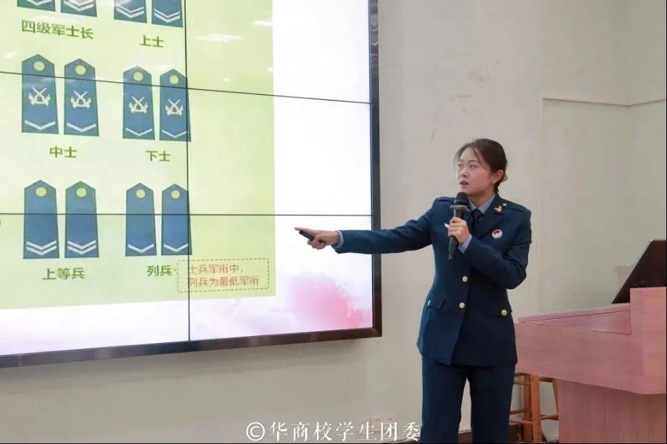 余彦婷先向在场的华商学子介绍了人民解放军的编制构成,阐释了军官和士官的异同,并告知华商学子们“什么是考学”、“什么是提干”以及“怎么考学”、“怎么提干”。同时,她详细讲述了女兵兵种的分类,介绍女兵兵种在军队中的工作任务。余彦婷还结合自身从社会青年到人民解放军这一人生方向定位的转变,鼓励华商学子在部队这个大熔炉里淬炼成钢,锤炼“巾帼不让须眉”的坚毅品质,用忠诚和热血演绎强军兴国的绚烂芳华。