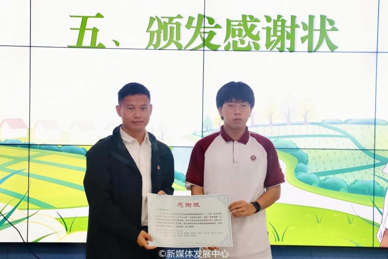 ——四会市黄田镇党委梁柱副书记为广州华商学院“小旅进镇”实践队颁发感谢状。