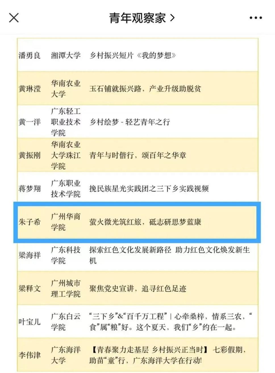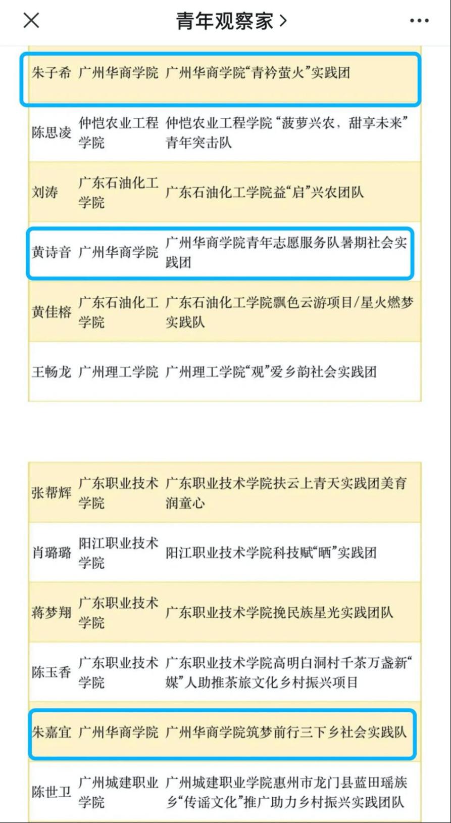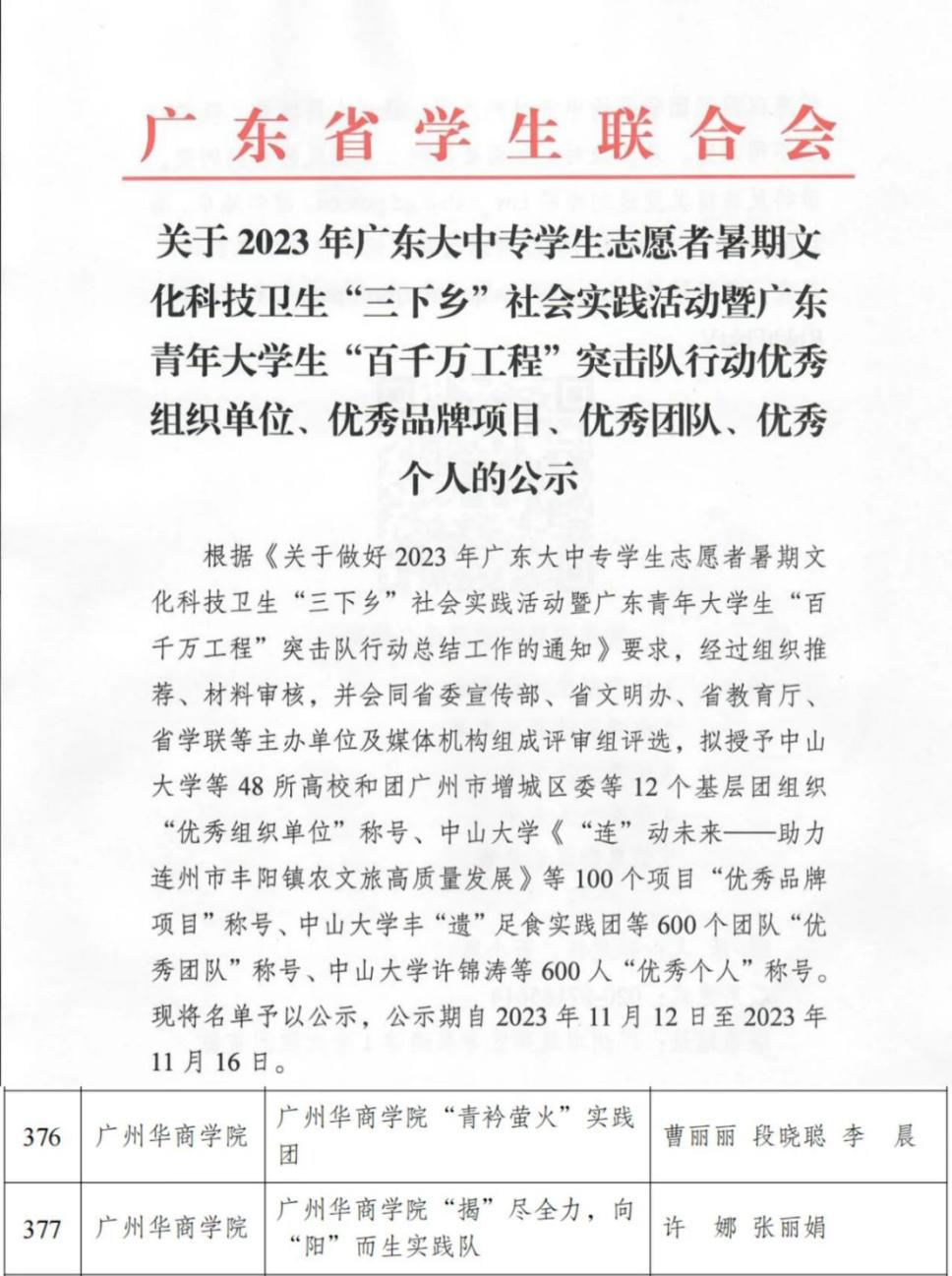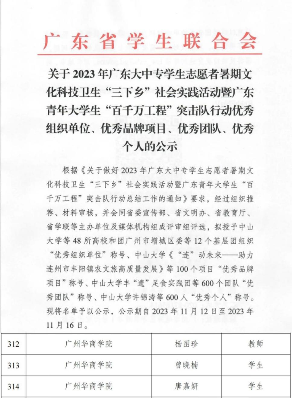中国青年报社主办的2023大学生社会实践成果“千校千项”网络展示活动中,广州华商学院青年志愿服务队暑期社会实践团、“青衿萤火”社会实践团、筑梦前行三下乡社会实践队获“项目优秀奖”“视频优秀奖”等奖项。