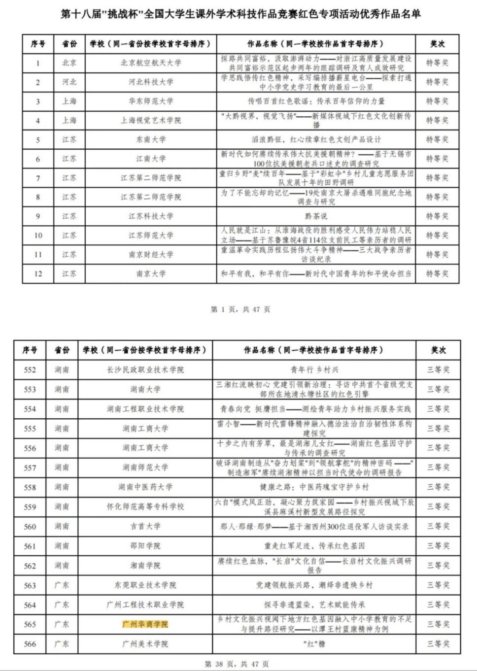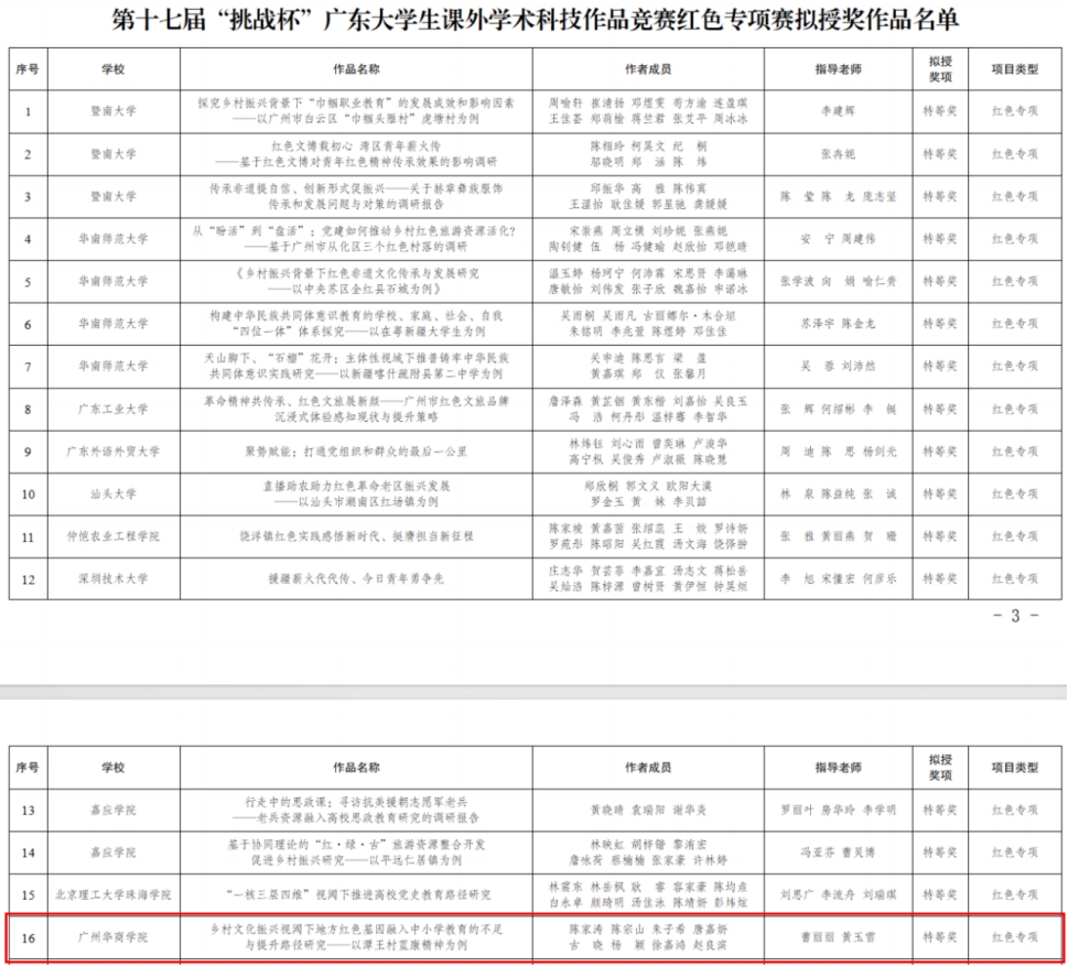 第十七届“挑战杯”广东大学生课外学术科技作品竞赛红色专项赛中,我校暑期三下乡社会实践团队“青衿萤火”作品《乡村文化振兴视阈下地方红色基因融入中小学教育的不足与提升路径研究——以潭王村蓝康精神为例》获省级特等奖。
