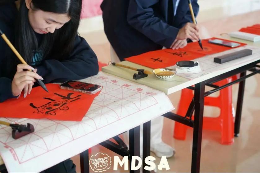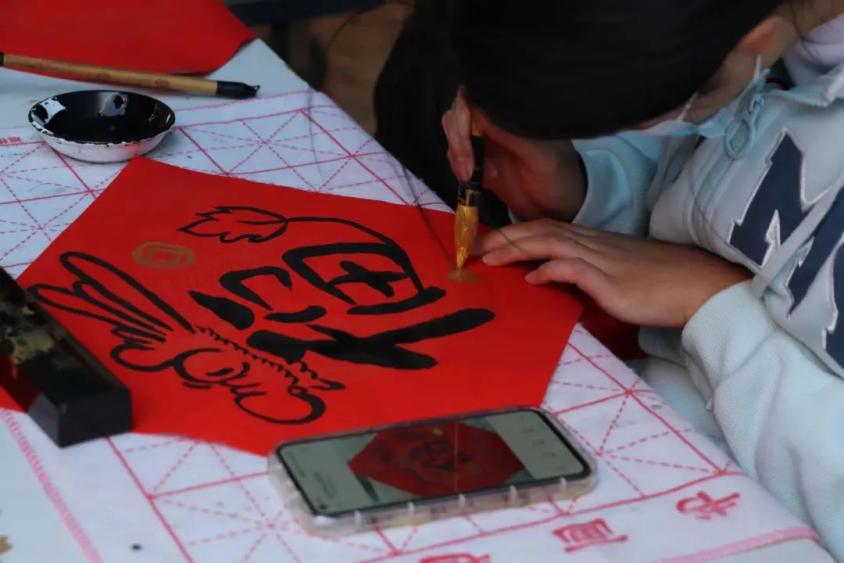 活动现场,我校书画协会的同学展纸援笔、挥毫泼墨,现场书写一幅幅寓意吉祥的春联。一个个饱含神韵的“福”字跃然纸上,散发淡淡墨香,传递出浓浓年味和温暖祝福,切实为全校师生送去新春问候。一笔一划,蕴含浓郁年味;一撇一捺,尽是古字韵味;一提一顿,是华商书写者的专注。现场收到对联的师生对此赞不绝口。