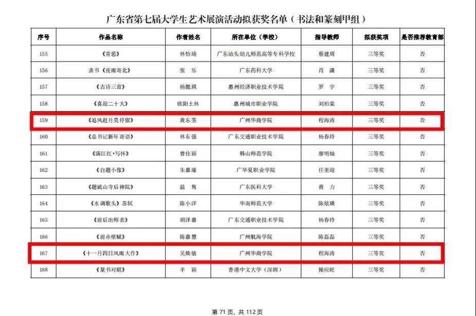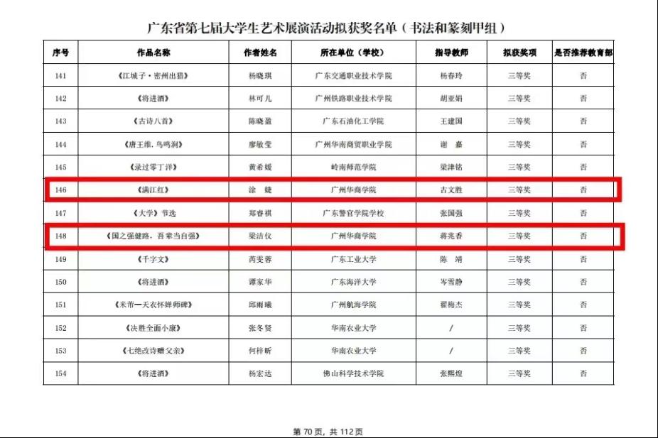 根据《广东省教育厅关于举办全省第七届大学生艺术展演活动的通知》要求,经组织专家评审,共评出拟获奖作品1158个,其中声乐类节目105个,器乐类节目80个,舞蹈类节目103个,朗诵类节目54个,戏剧类节目35个、绘画类作品137个、书法和篆刻类作品234个、摄影类作品96个、设计类作品155个、微电影类作品68个、校长风采作品7个、艺术实践工作坊20个、优秀案例64个、优秀组织奖27个。