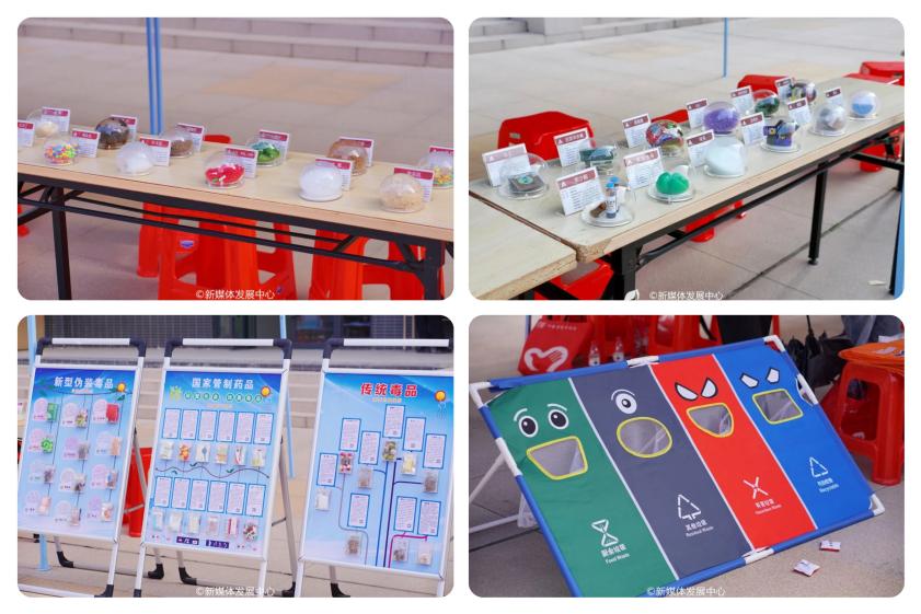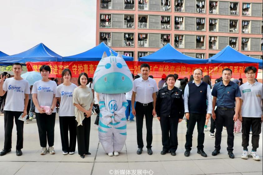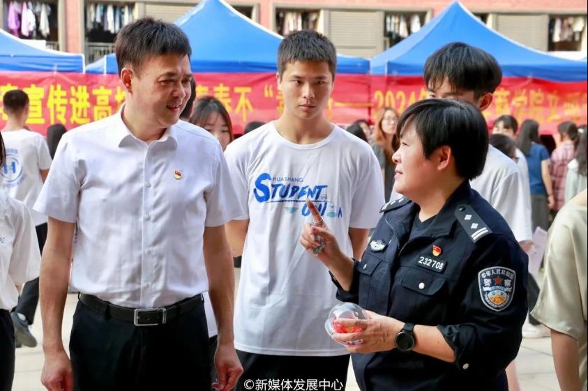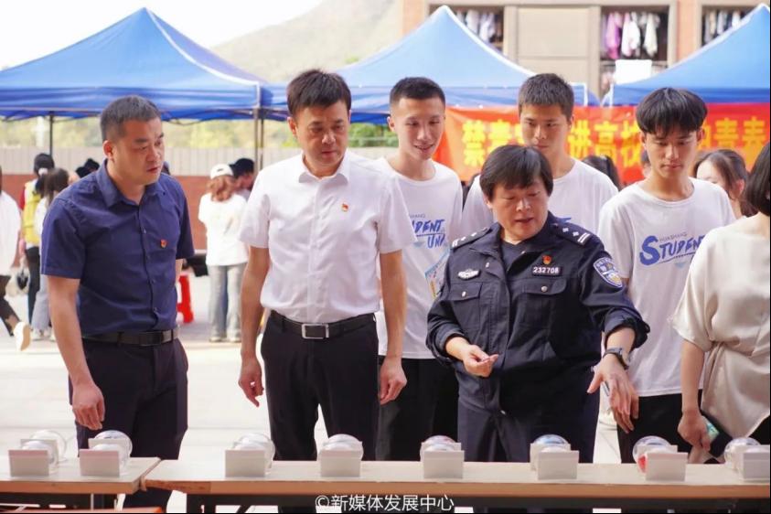 吴舒琪主任和肇庆校区党委苏宁书记、团市委曾华智副书记等领导一同参观展区摊位。吴主任热情地为苏书记和同学们讲解摊位上展示的仿真毒品。通过这次活动,大家收获良多,对毒品、禁毒相关知识了解更深入,更清晰作为一名新时代青年助力禁毒活动的责任和使命。