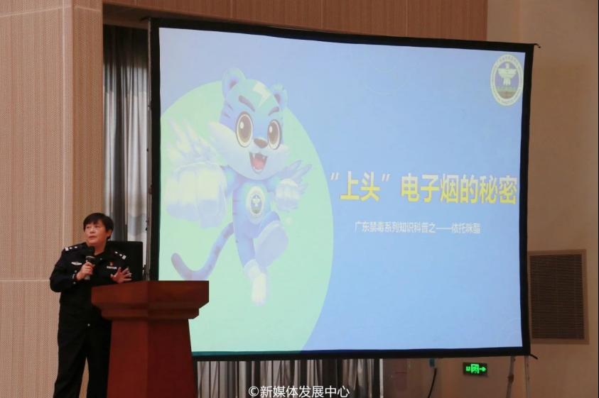 ——吴舒琪教导员作禁毒宣讲。四会市公安局禁毒大队教导员吴舒琪主任为同学们作禁毒宣讲。吴舒琪主任首先向同学们展示新型毒品“上头”电子烟,该类型电子烟中含有依托咪酯此种成瘾物质,而依托咪酯在2023年10月1日已正式被列为国家第二类精神药品目录。以该物资制作的电子烟在青少年群体中传播迅速,极大危害青少年群体的身心健康。