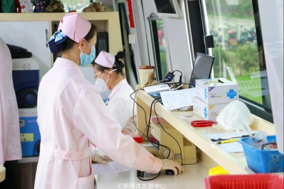 医生为献血者耐心讲解注意事项,现场的医护人员仔细认真工作。