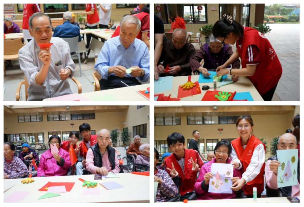 志愿者团队和老人们一起进行手工折纸艺术创作和绿美创意DIY植物标本的制作,在制作过程中,志愿者与老人们聊天交流,分享自己的大学生活,关心老人们的生活日常与身体状况,为他们带去温暖和爱。为社区建设出力,为绿美广东建设贡献出自己的力量。
