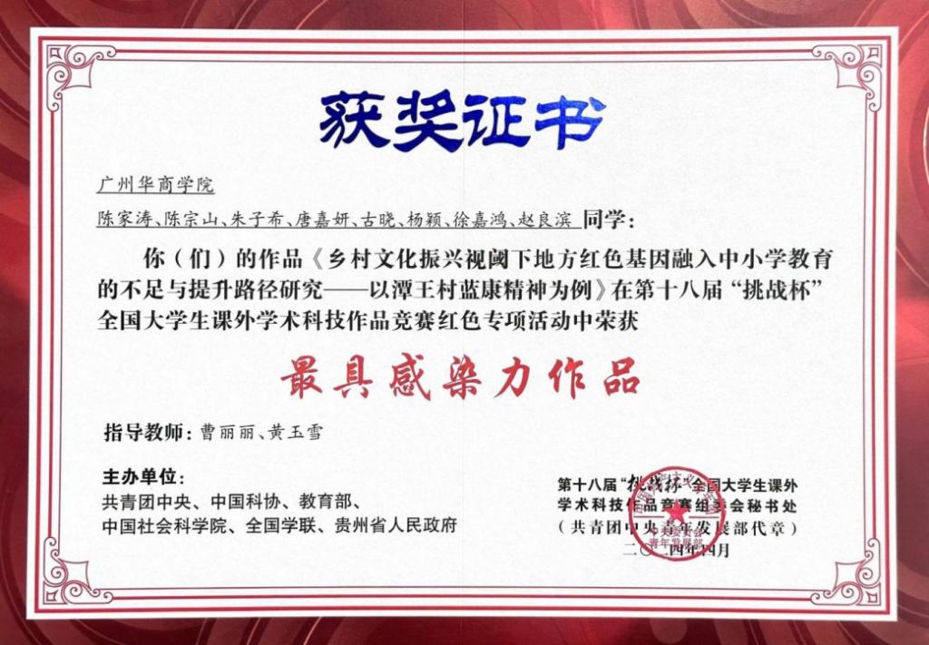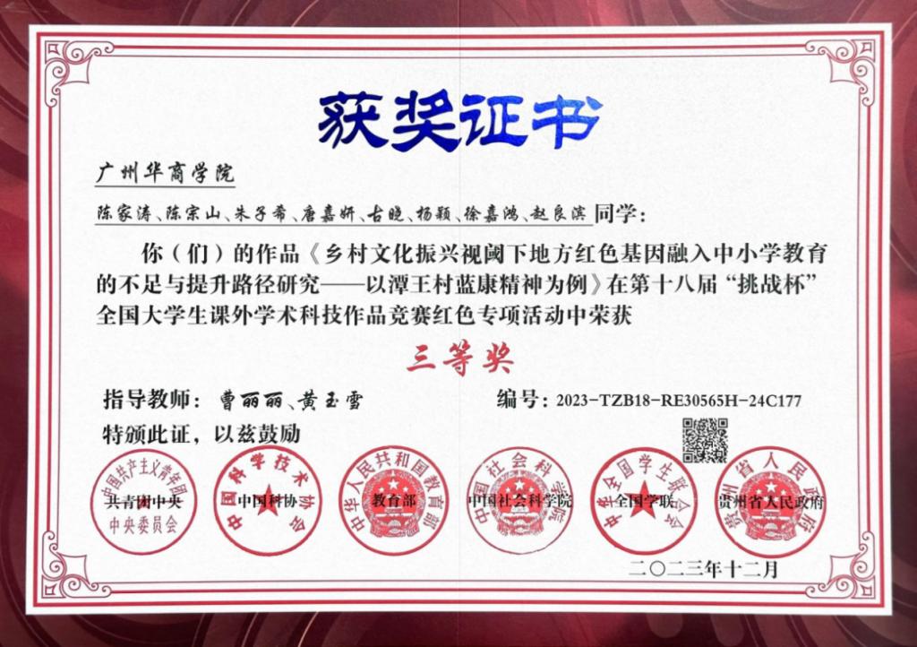 ——第十八届“挑战杯”全国大学生课外学术科技作品竞赛红色专项活动。我校省级重点“百千万工程”突击队——青衿萤火志愿服务队团队作品《乡村文化振兴视域下地方红色基因融入中小学教育的不足与提升路径研究—— 以潭王村蓝康精神为例》荣获第十八届“挑战杯”全国大学生课外学术科技作品竞赛红色专项活动三等奖、最具感染力作品;第十七届“挑战杯”广东大学生课外学术科技作品竞赛红色专项赛省级特等奖;获2023年广东省暑期“三下乡”省级“优秀团队”;入选2024年全国大学生科技志愿服务团队、全国“七彩假期”志愿服务示范团队、2023 大学生社会实践成果“千校千项”网络展示活动“项目优秀奖”与“视频优秀奖”、入围 2023 年"我的返家乡实践故事"征集活动展示点赞环节等荣誉。