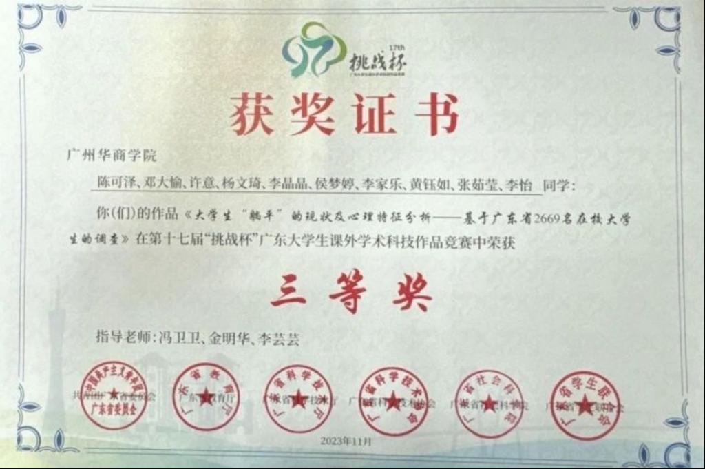 ——2023年广东省科技创新战略专项资金。由团省委、省财政厅联合设立的2023年广东省科技创新战略专项资金(大学生“攀登计划”科技创新培育),我校7个项目获得立项资助,其中重点项目1项、一般项目6项,共获得省财政专项资助12万元。日前,被抽中的四个项均已顺利完成校级中期检查。其中《大学生“躺平”心态的现状、成因及对策研究——基于广东省10所高校2000名大学生的调查研究》也获得第十七届“挑战杯”广东大学生课外学术科技作品竞赛省赛三等奖。《承宣新型砂带连接技术》获第十四届中国大学生服务外包创新创业大赛全国三等奖。