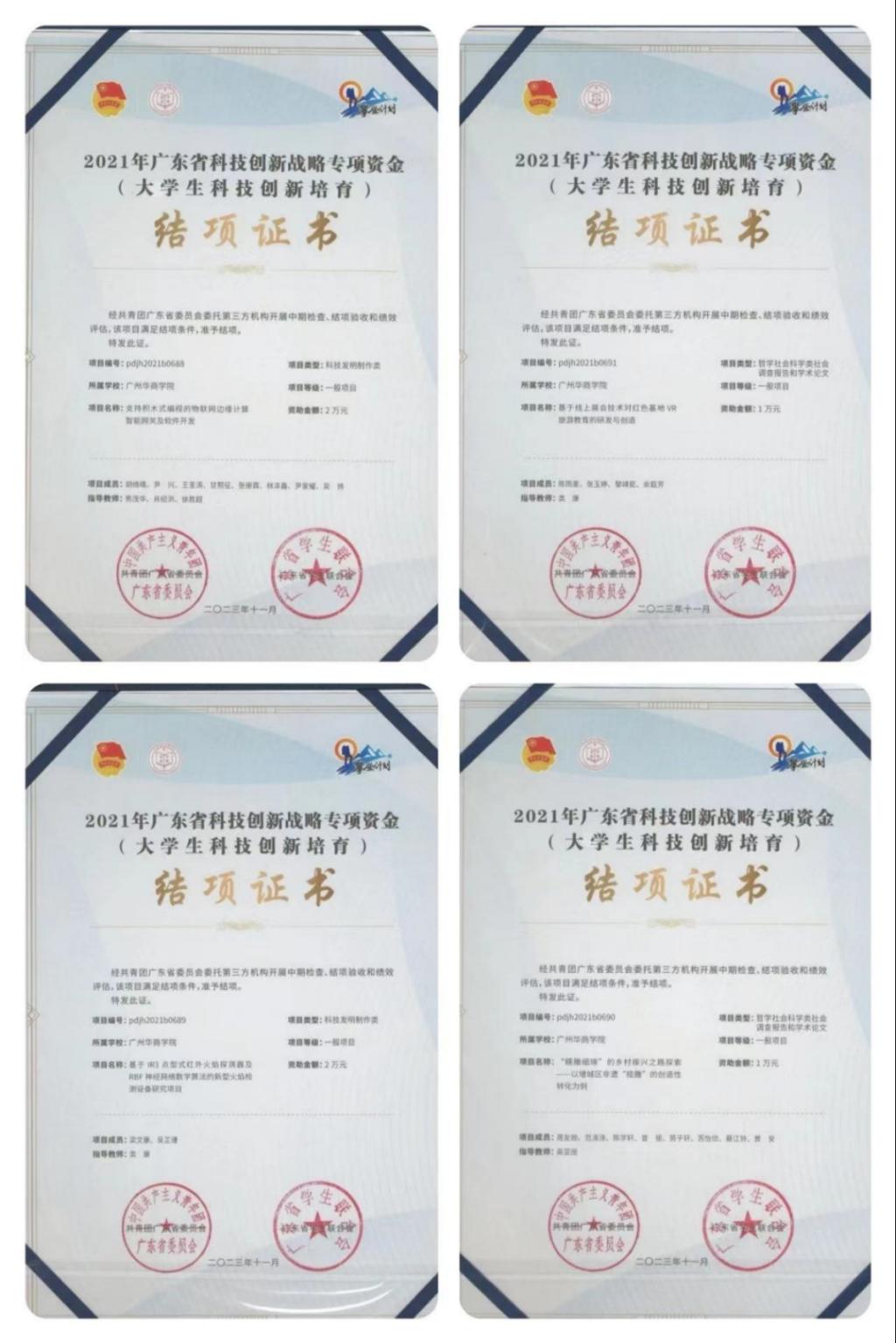 ——2021年“攀登计划”项目结项证书下发。2021年广东省科技创新战略专项资金(大学生科技创新培育)“攀登计划”结项认证,共有四组项目成功结项,收到证书认证。分别是《支持积木式编程的物联网边缘计算智能网关及软件开发》《基于IR3点型式红外火焰探测器及RBF 神经网络数学算法的新型火焰检测设备研究项目》《基于线上展会技术对红色基地 VR旅游教育的研发与创造》和《“精雕细琢”的乡村振兴之路探索——以增城区非遗“榄雕”的创造性转化为例》。