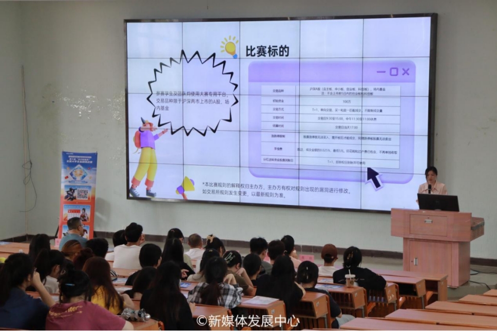 东方财富集团广东地区负责人张婷老师进行赛事宣讲。她强调,“东方财富杯”全国大学生金融安全知识网络比拼活动由共青团中央青年发展部主办,全国学校共青团研究中心、东方财富信息股份有限公司承办。活动旨在加强对大学生的金融知识普及教育,帮助大学生掌握金融基础知识,增强金融安全意识,提高金融索养和社会化能力。随后,张老师从报名方式、比赛规则、奖项设置以及往届赛事对比赛进行详细介绍,着重强调了“东方财富杯”大赛的重要性、权威性,鼓励同学们勇于尝试,积极参与。