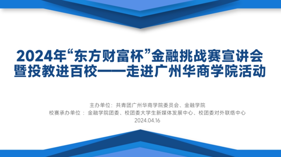 为帮助华商学子掌握金融基础知识,增强金融安全意识,加深对“东方财富杯”知识竞赛的了解,丰富华商青年的参赛经验、锻炼创新思维和语言表达能力,4月16日下午,学校团委、金融学院团委在励志楼C408组织开展2024年“东方财富杯”金融挑战赛宣讲会暨投教进百校——走进广州华商学院活动。参加本次活动的嘉宾有:东方财富集团广东地区负责人张婷,东方财富证券深圳科技园营业部总经理康卫荣、营业部综合经理黄靖翔,会计学院张小云老师,金融学院荣佳老师、钟坚毅老师以及金融学院团委书记张文杰。