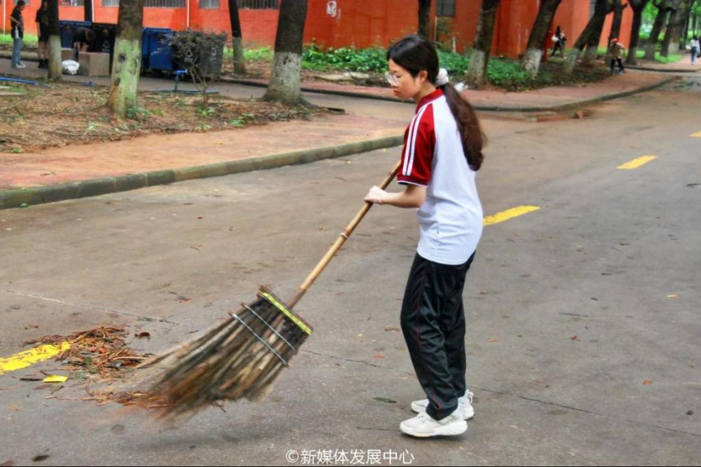 经过将近两个小时的共同努力,责任区域的断枝、杂枝、落叶、淤泥等被清理得干干净净,校园环境焕然一新。