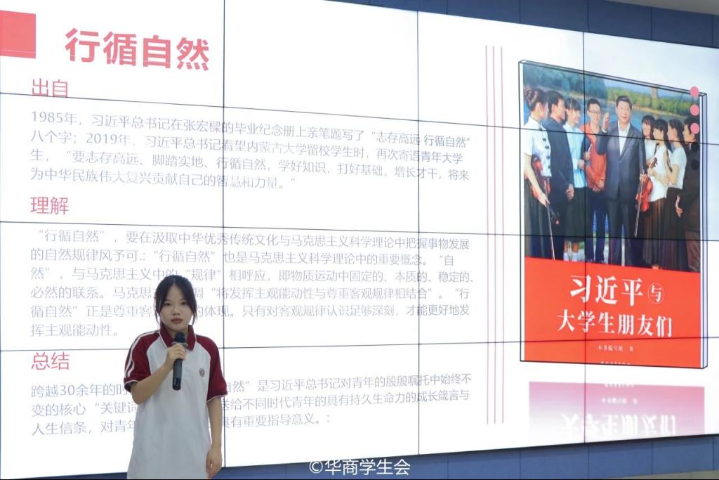 ——文学院学生会代表作分享。在 2021年4月的人民日报中有这样一段话让我触动很深,“阅读是历史的回望、心灵的净化,也是梦想的启示、希望的播撒:是思想的觉醒精神的刷新,更是文明的接力、文脉的传承”这段有深度的文字彰显着阅读的力量。借着“世界读书日”的契机我精读了《习近平与大学生朋友们》这本书。从中可以看到习近平总书记对大学生、青年成长的深切关心、大力帮助与殷殷期待,感受到习近平总书记勤政爱民、良师益友的亲切形象。华商学子应保持特有的专业自信,认真钻研学业知识,打造丰富的精神内核,同时不负先辈之厚望,做到披荆斩棘、敢为人先!