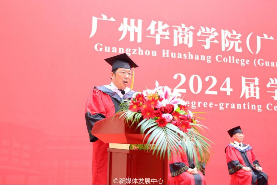 广东财经大学党委常委、副校长邹新月教授致辞。他表示,华商学院自创办至今走过十九个春秋。十九年来,全体华商人披荆斩棘、勇攀高峰,办学规模不断扩大,教学质量稳步提升,师资队伍日益壮大,管理水平有口皆碑,办学水平不断提高。广东财经大学作为华商学院曾经的母体学校,与之关系密切,始终坚定不移地支持和关注华商学院的成长。他向我校毕业生提出三点希望:一要心怀家国,志存高远。把青春奋斗融入党和人民事业,成为实现中华民族伟大复兴的先锋力量。二要永葆初心,终身学习。在实践中锤炼本领、创造新知。三要坚守理想,奋发有为。要以无惧挑战的决心、不怕艰难的斗志、永不服输的姿态,直面事业上的各种挑战,奋力书写为中国式现代化挺膺担当的青春篇章。