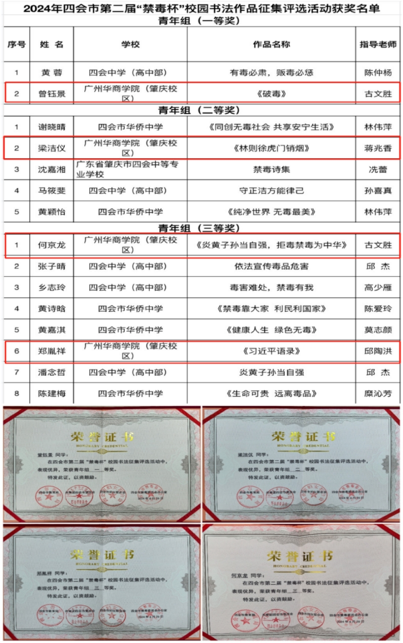 2024年6月26日,迎来了第37个国际禁毒日。四会市禁毒办联合多部门,以“健康人生,绿色无毒”为主题,精心策划了一系列禁毒普法宣传活动。为深入贯彻习近平总书记关于禁毒工作重要指示精神,全面贯彻落实党的二十大精神,加大禁毒宣传力度,提高高校学生禁毒意识,增强华商学子对毒品种类特性及危害的认识,提升居民识毒、辨毒、查毒能力,我校团委组织学生参加四会市第二届“禁毒杯”校园书法征集评选活动。活动收到超过100份报名作品,获青年组一等奖1名、二等奖1名、三等奖2名。
