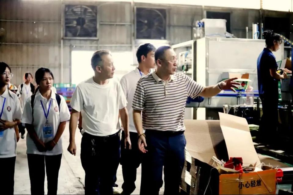 7月10日,广州华商学院“小旅进镇”实践团与指导老师一起前往四会市黄田镇,与黄田镇相关领导围绕新媒体技术在乡村振兴中的应用问题,充分交流积极探讨“百千万工程”的工作计划与实施问题,开展“百千万工程”突击队行动暨大学生暑期“三下乡”社会实践交流会,并在会后前往黄田镇飞凰饮料有限公司进行参观交流。在工厂参观活动中,跟随着机器传输带的运转前进,广州华商学院“小旅进镇”实践团成员见证了一个沙糖桔如何变成一罐汽水。