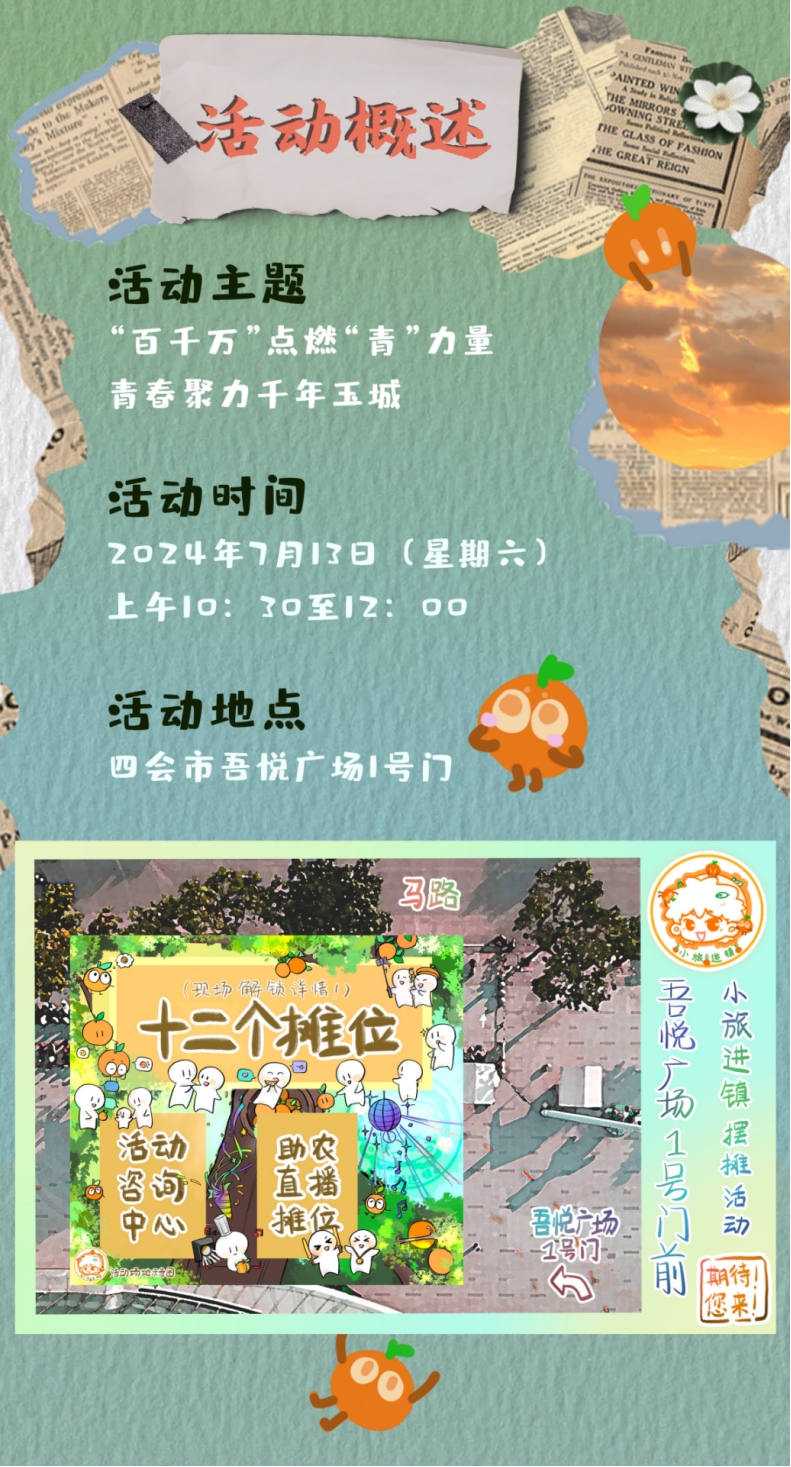 “凝聚青春力量,聚焦乡村振兴”,广州华商学院“小旅进镇”实践团为进一步扩大文创ip影响力,凝聚更多力量助推乡村振兴,在团市委的指导下,号召12支“百千万工程”青年突击队,共同开展“百千万”点燃“青”力量,青春聚力千年玉城青年集市活动。希望通过集市,以文创产品的形式,让乡村特色文化绽放在更大的舞台。