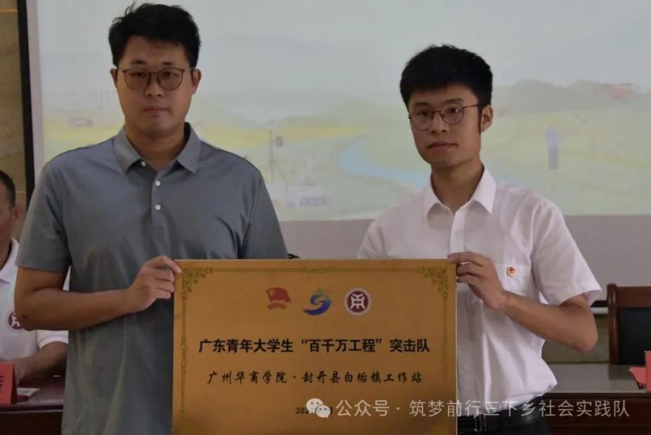 揭牌仪式。共青团广州华商学院委员会何以立老师和共青团封开县白垢镇委员会杨海麒书记进行广东青年大学生“百千万工程”突击队广州华商学院•封开县白垢镇工作站揭牌仪式。