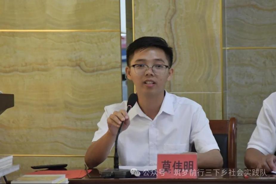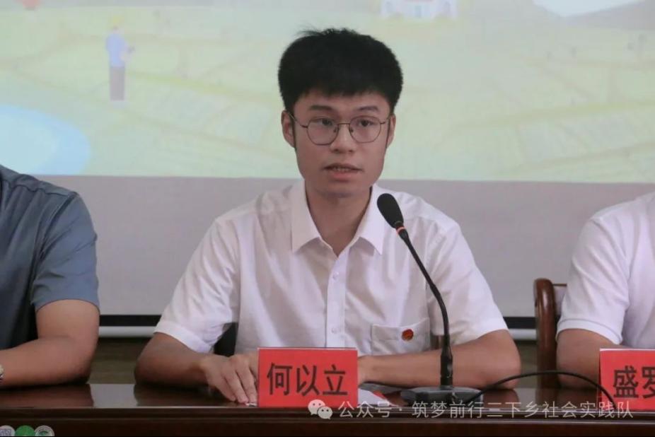 共青团广州华商学院委员会何以立老师讲话。共青团广州华商学院委员会何以立老师代表广州华商学院团委向白垢镇党委、政府、团委、白垢学校及相关单位对暑期“百千万工程”突击队的大力支持表示诚挚的感谢。何以立老师代表广州华商学院团委对“筑梦前行”社会实践队成员提出三点希望:第一,提高政治站位,做挺膺担当的百千万人。第二,聚焦实践主题,做脚踏实地的百千万人。发挥专业优势,将所学知识与实践相结合。第三,应树立安全意识,做健康平安的百千万人。始终把生命安全和身体健康放在首位。何以立老师指出,广州华商学院将依托本次广东青年大学生“百千万工程”突击队广州华商学院•封开县白垢镇工作站为阵地,进一步完善校地协同衔接机制,为白垢镇基层社会治理、乡村振兴、高质量发展注入澎湃强劲的青春动能。