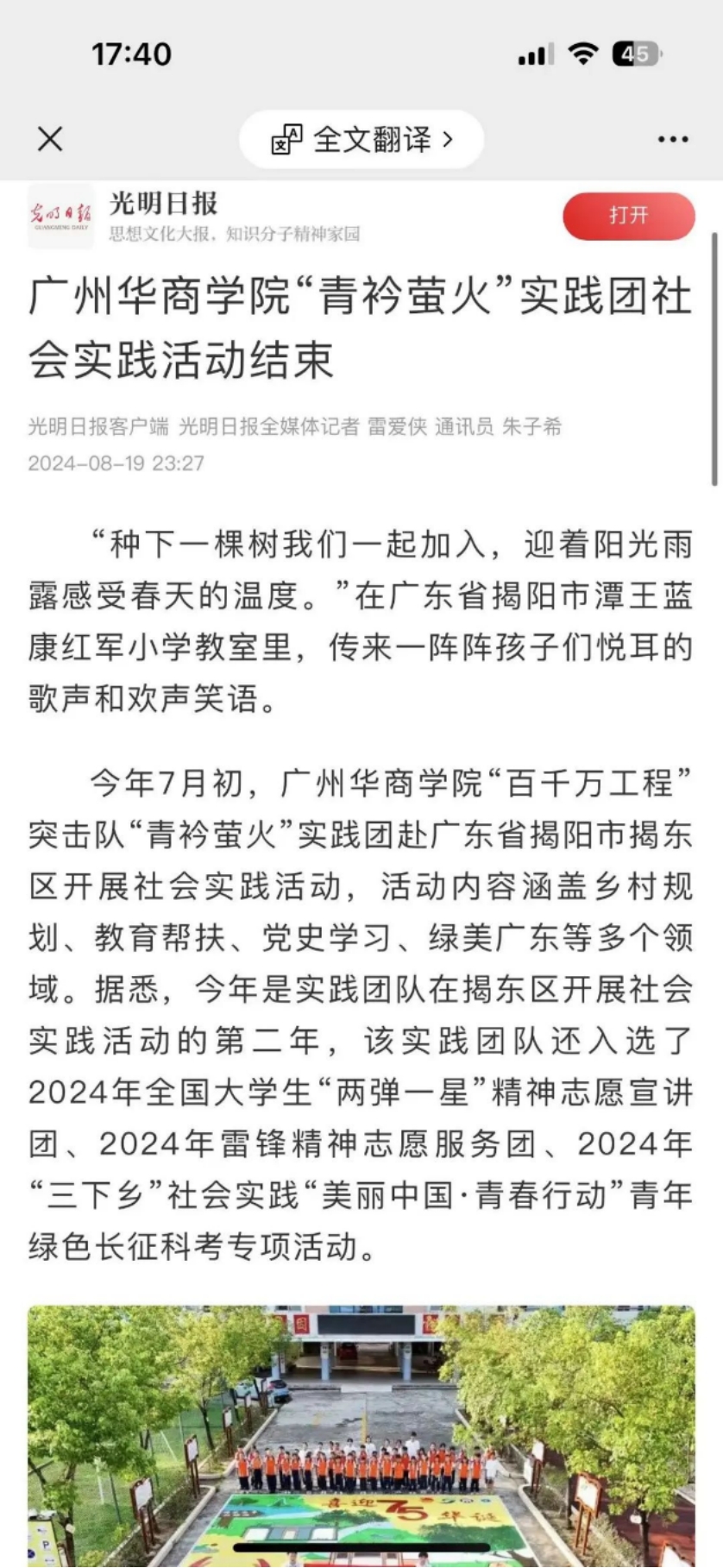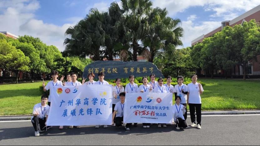——晨曦先锋“百千万工程”突击队。2024年7月13日至7月22日,由广州华商学院19名在校师生组成的晨曦先锋“百千万工程”突击队,赴广州市增城区石滩镇开展了为期10天的“多彩假期映童心,德智体美齐发展”2024年暑期公益夏令营活动。实践队始终坚持“为党育人,为国育才”的理念,将“德智体美劳”五育并举,累计开展课程32节,课时时长达2880分钟,服务青少年、儿童超500人次,其中共服务困境青少年、儿童88人次。课程包括但不限于跆拳道、羽毛球、太极拳等体育运动课程,水火箭发射、空气炮等科学课堂,漆扇、扎染、黏土、折纸等手工课程,趣味英语、角色扮演、中国象棋、探索自然等趣味益智课堂,唱歌、手势舞、朗诵等美育课堂,以及红色文化、运动安全、防溺水安全、食品安全等宣讲活动。实践事迹被大学生网报、增城青年、惠州新闻网等媒体报道,阅读量超5000人次,实践视频播放量超1000人次,实践队以实际行动深刻诠释了“为党育人、为国育才”的深刻内涵,为培养德智体美劳全面发展的社会主义建设者和接班人贡献了青春力量。