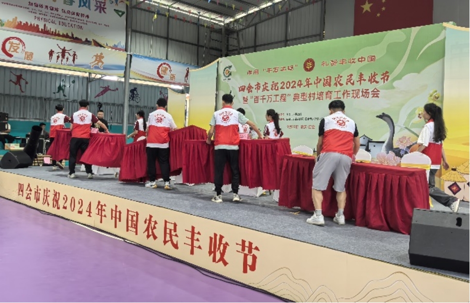 华商志愿者为本次的丰收节开幕布置好活动场地,并在活动开始前协助进行活动的彩排,保证活动的顺利开展。