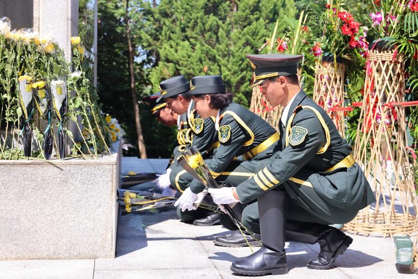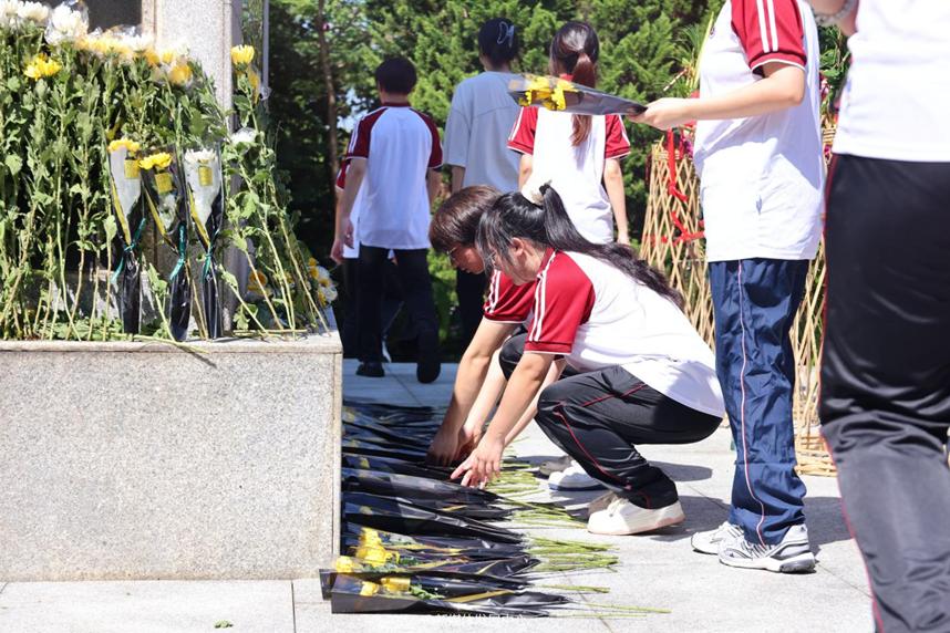 伴随着低沉哀婉的《献花曲》,师生代表向人民英雄敬献花篮、鲜花。国旗护卫队仪仗队、全体师生依次献上鲜花,以表对英雄烈士的敬仰和哀悼之情。