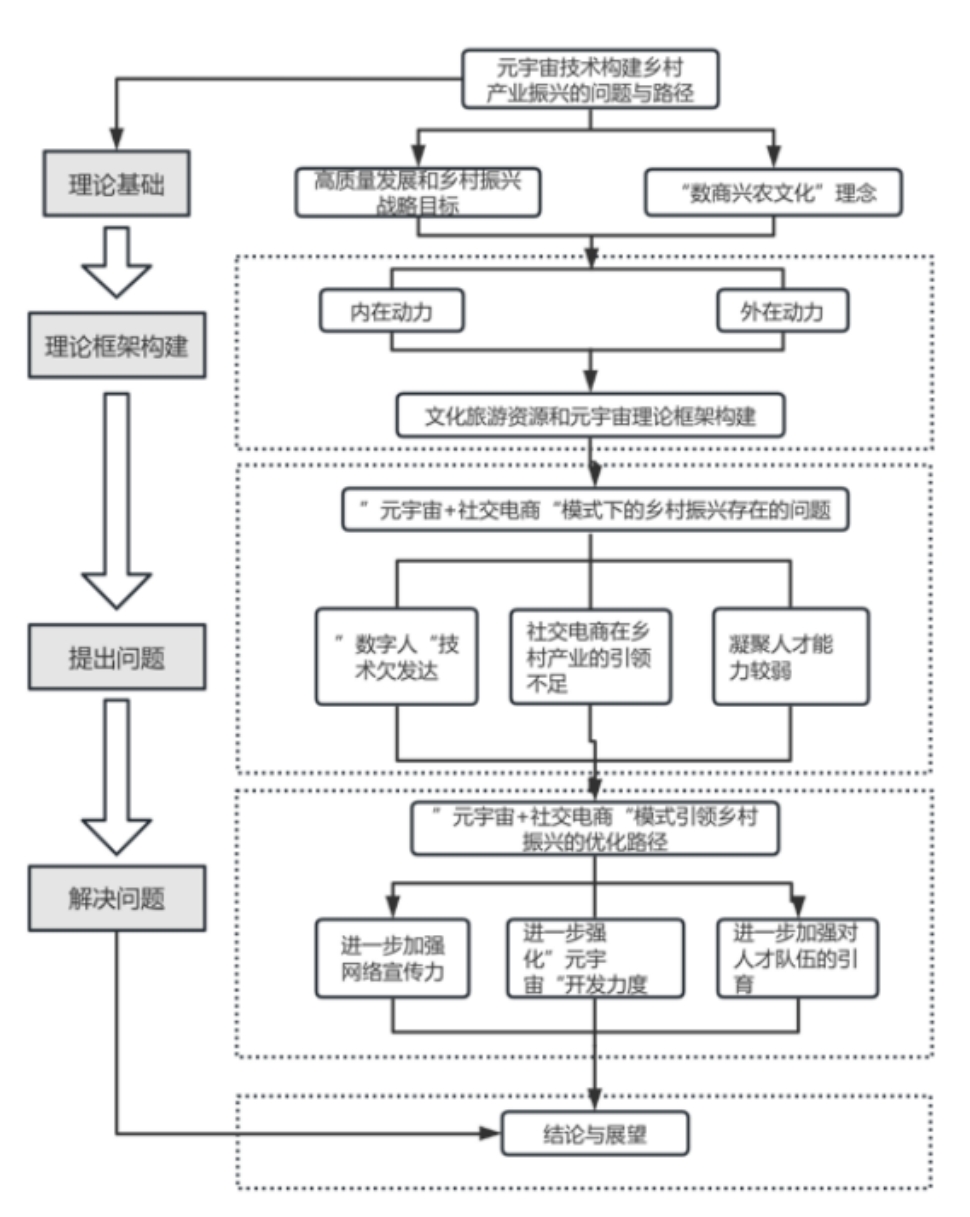 本研究旨在探讨“元宇宙+社交电商”模式如何助力中国乡村振兴战略,解决乡村特色产业发展中的问题,促进乡村经济的全面振兴和乡村高质量发展。研究团队以肇庆市上清湾村为案例,通过实地调研和政策分析,探索“元宇宙+社交电商”模式在乡村产业发展中的应用和潜力。下图为研究方法路线图。本文研究“元宇宙+社交电商”模式在乡村振兴中的应用,探讨该模式如何促进乡村高质量发展。文章创新性地提出了基于“元宇宙+社交电商”的乡村振兴方案,并将其应用于实际,致力于为乡村特色产业的成长提供全新解决方案。通过构建数字化的乡村虚拟空间,为乡村的数字化转型和品牌建设何乡村特色产业发展提供新的方向,同时为实施乡村振兴战略提出新的思路和方法。