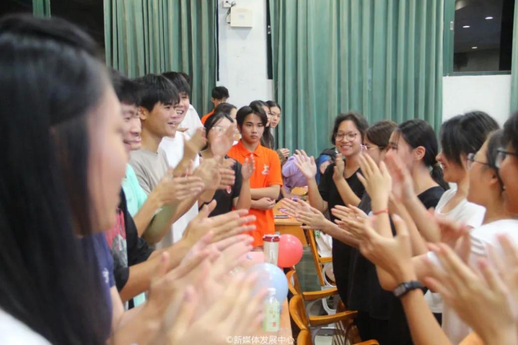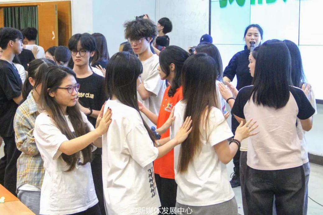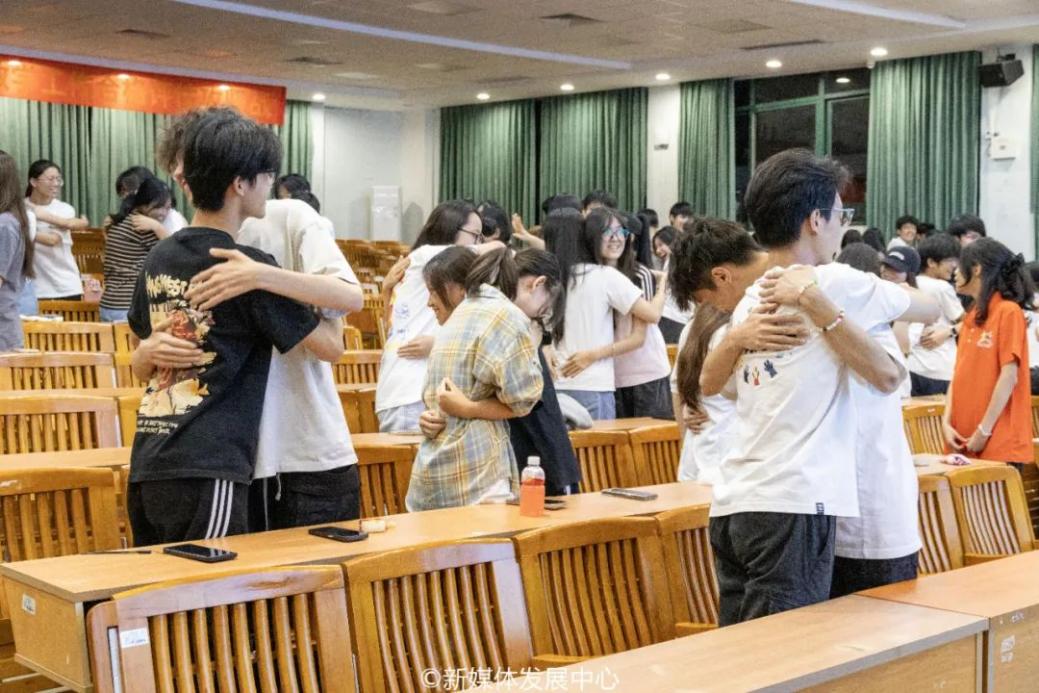 在缘分问候游戏中,学生骨干们面对面手牵手。随着“五千年,全球人口70亿,哇塞!是缘分啊!”的欢呼声,他们紧紧拥抱,彼此间的陌生感瞬间消除。通过第一个小游戏,同学们迅速融和,场面温馨和谐。