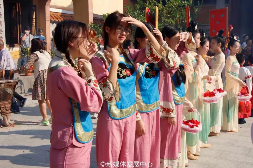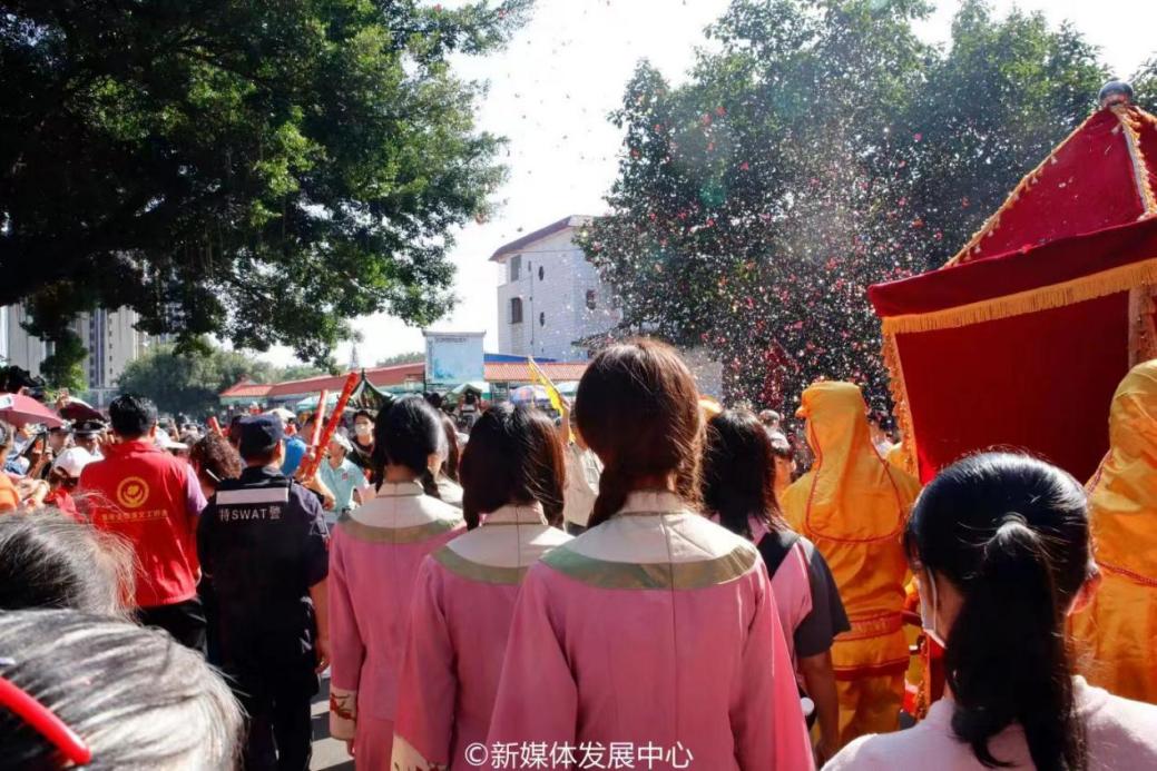 活动当天,三十名志愿者被分为鲜花队和志愿者队,分别承担了不同的志愿服务任务。在贞仙诞巡游活动中,鲜花队的志愿者们身着统一的服装,梳着双麻花辫,面带微笑。他们手持鲜花,跟随巡游队伍,有序地协助活动的进行,展现了华商青年志愿者的热情与活力。
