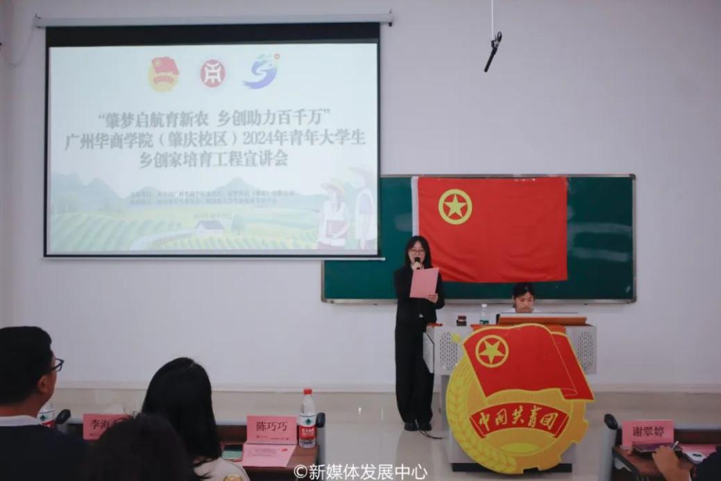 为深入学习贯彻党的二十届三中全会精神,认真贯彻落实团省委关于“百县千镇万村高质量发展工程”工作部署,推动实施“肇梦计划”——肇庆市青年乡创家培育工程,积极培育青年大学生乡创家,助力乡村振兴高质量发展,10月29日14:30,“肇梦启航育新农 乡创助力百千万”——广州华商学院(肇庆校区)2024年青年大学生乡创家培育工程宣讲会在肇庆校区6号楼206举行。讲座由众擎科技(肇庆)有限公司总经理李海杰、肇庆市抖音扶贫助农带货优质主播谢翠婷主讲。校团委副书记陈巧巧、广东胜景游肇庆有限公司梁枝华、数字经贸学院团委书记曾庆威、传播与传媒学院团委副书记杨伟捷、校团委专职团干何以立参加本次宣讲会。
