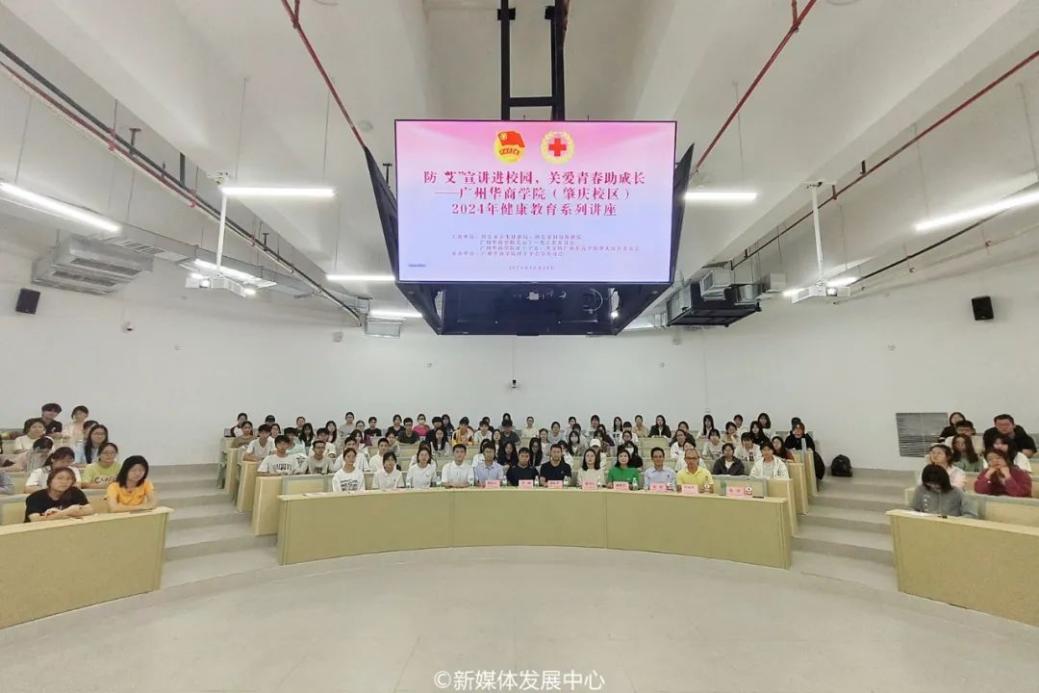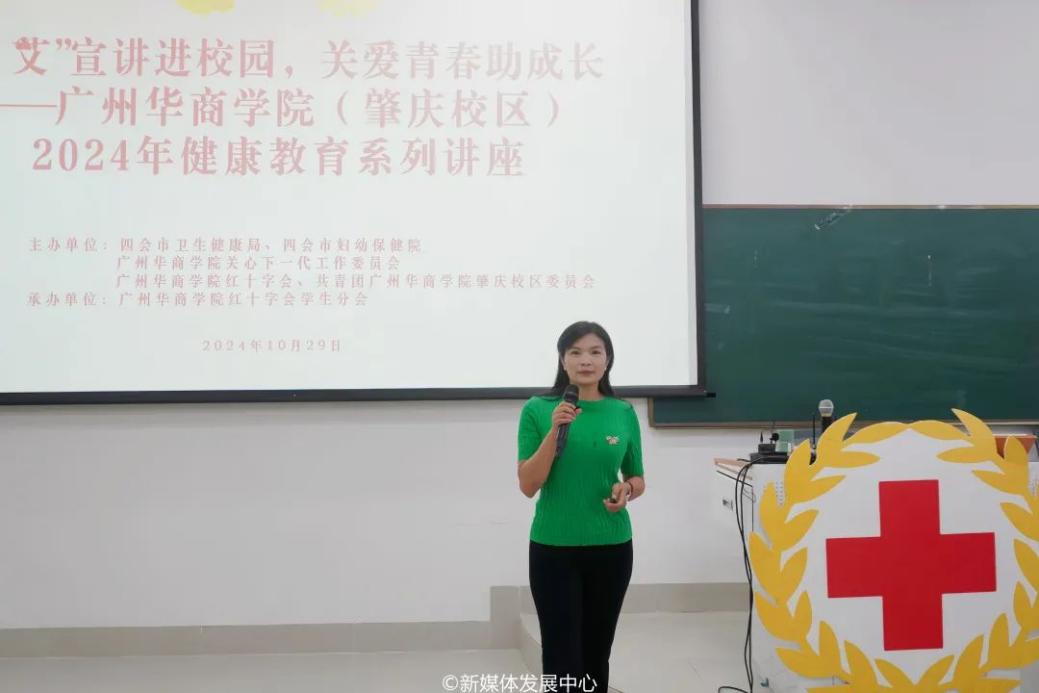 为宣传和推动预防性疾病传播与宫颈癌乳腺癌防治宣传工作,提升华商学子医疗健康知识,增强防范意识,倡导健康生活方式,营造积极向上的校园文化氛围,2024年10月30日15:00—16:00,在学校党委的领导下,校团委联合校关工委、校红会、四会市卫生健康局、四会市妇幼保健院在肇庆校区16号楼212举办防“艾”宣讲进校园,关爱青春助成长——广州华商学院(肇庆校区)2024年健康教育系列讲座。四会市卫生健康局三级主任科员杨光华,四会市计划生育协会科员李轲,四会市妇幼保健院副院长谢艳芬,四会市妇幼保健院保健部副科长陈海明,四会市妇幼保健院出生缺陷防控中心负责人郑慧频,四会市妇幼保健院儿科医师、精神科医师麦新,校团委副书记陈巧巧老师,校团委何以立老师及200+师生代表参加本次活动。