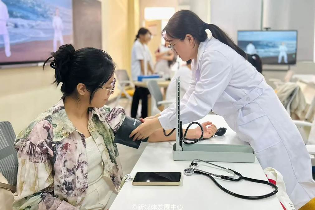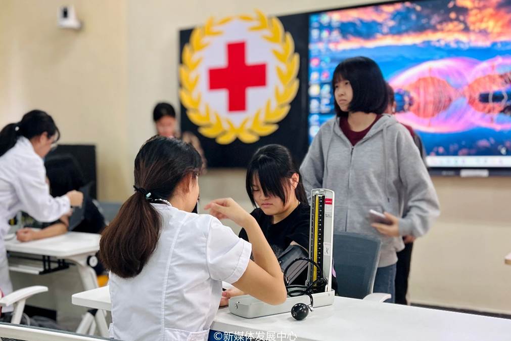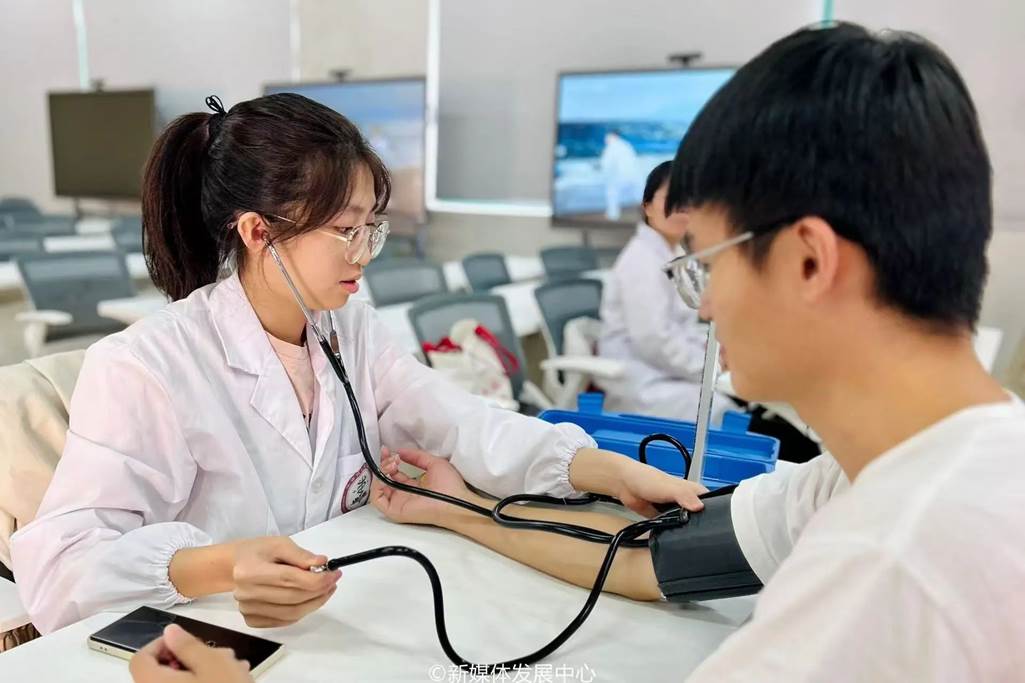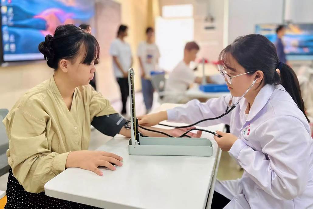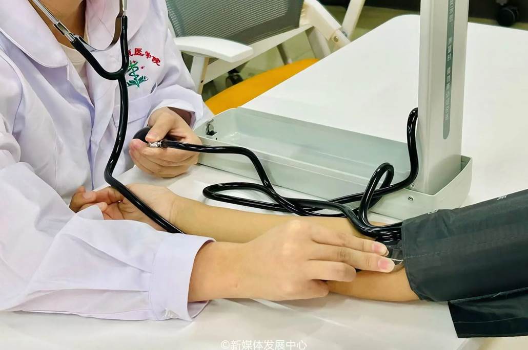 活动现场,志愿者们热情满满,身着整洁的白大褂,佩戴专业的听诊器,将课堂所学专业医学知识化作实践运用,耐心细致地为师生们逐一测量血压,展现华商青年的奉献精神,为我校师生的身体健康筑起一道坚实的防线,默默守护校园的健康安全。