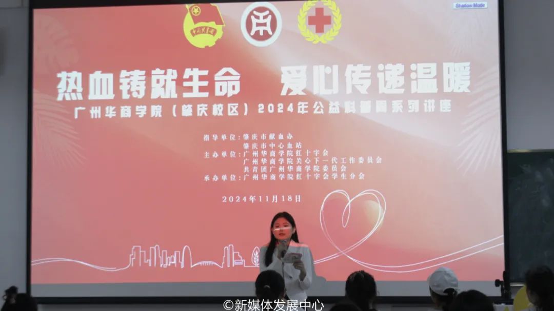 为进一步加强无偿献血科普知识宣传,普及血液健康知识,进一步加强当代大学生的社会责任感,引导大学生群体积极参与无偿献血公益事业,广州华商学院关心下一代工作委员会、广州华商学院红十字会、共青团广州华商学院肇庆校区委员会、广州华商学院红十字会学生分会会于11月17日在肇庆校区16号楼105开展“热血铸就生命,爱心传递温暖”——广州华商学院(肇庆校区)2024年公益献血科普系列讲座,参与本次讲座的领导及嘉宾有:校团委副书记陈巧巧老师,肇庆市中心血站血源科副主任、主治医师李敏玲女士,肇庆市中心血站钟楚君女士,活动吸引了200多名观众,推动在校更多师生参与无偿献血公益事业。