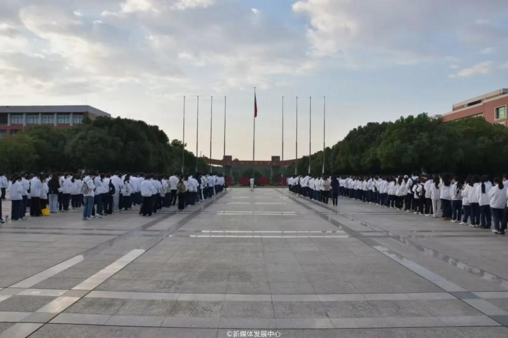 升旗台前全体师生庄严肃静,国旗护卫队扬起国旗,伴随着国歌的响起,华商学子齐齐抬头注视着国旗的缓缓升起。