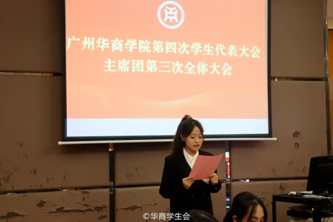 12月15日15:30,广州华商学院第四次学生代表大会主席团第三次全体会议顺利召开。会上,总监票人报告大会选举情况,确定当选人名单,确定广州华商学院第四届学生会委员会第一次全体会议的召集人和会议时间。