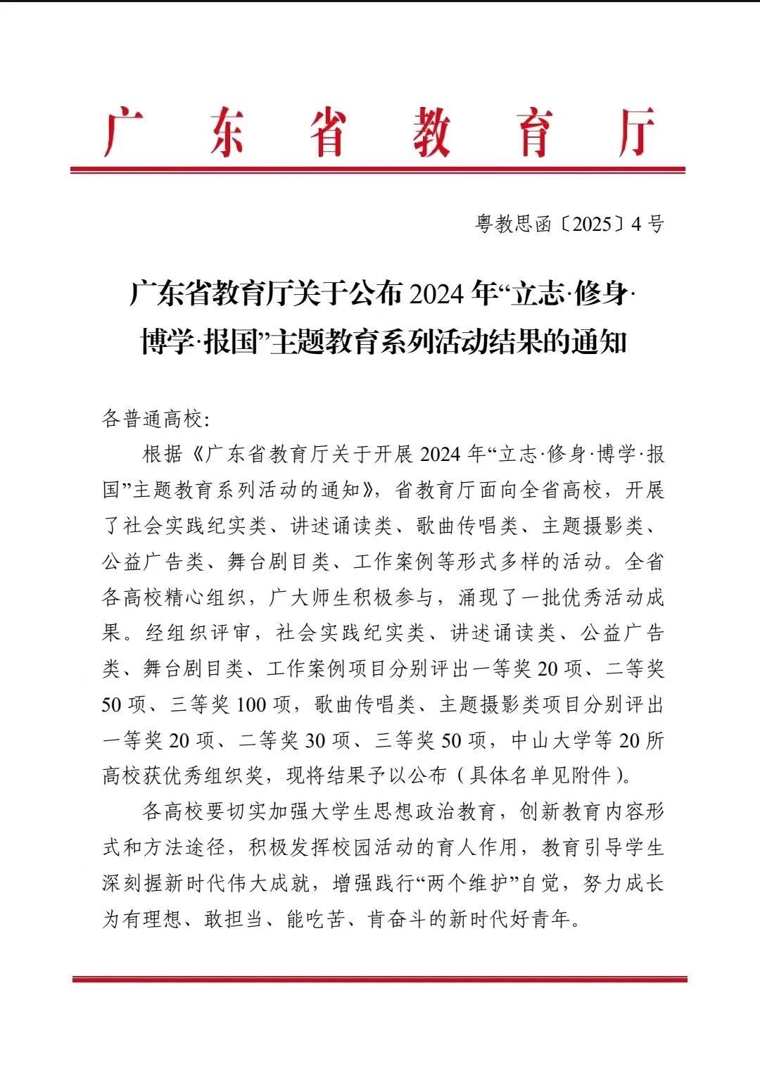 近日,广东省教育厅公布了2024年“立志•修身•博学•报国”主题教育系列活动结果,我校师生在主题教育系列活动中喜获佳绩,我校师生凭借优秀表现,斩获5项省奖。其中,我校百千万工程突击队在社会实践纪实类项目分别荣获1项一等奖和2项三等奖;讲述诵读类荣获1项三等奖;工作案例类荣获1项三等奖。