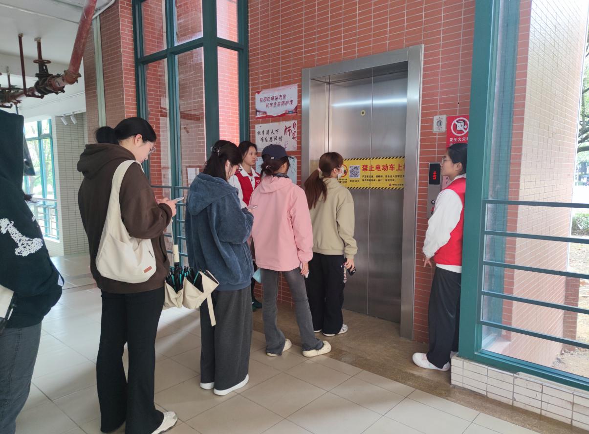 志愿者们穿上红马甲后到达各教学楼一楼引导同学们有序排队等候,及时劝阻不文明行为,倡导“先下后上”、“礼貌让行”等文明行为,以实际行动传递正能量,共同维护良好的校园公共秩序。他们分布在校园内的各个电梯口,用微笑和热情迎接每一位进出电梯的师生。志愿者们不仅负责引导师生有序乘梯,避免超载和拥挤,还积极宣传电梯安全知识和文明乘梯的重要性,提醒大家在乘梯时遵守规定,注意个人安全。