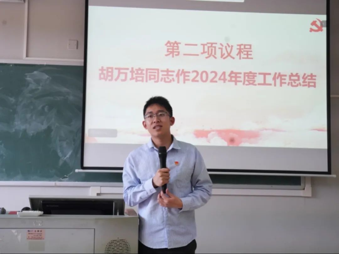 胡万培同志结合支部实际发展情况,作2024年度支部的工作汇报:一、筑牢思想根基,夯实党建堡垒。支部严格落实“三会一课”等党内制度,严肃党内政治生活,深化理论学习,提高政治素养,充分发挥党组织战斗堡垒作用和党员先锋模范作用。二、增强服务本领,躬身实践力行。支部全体党员同志不断提升自身能力,锤炼服务群众的本领,以实干担当践行初心使命,积极参与自行车骑游大赛等一系列特色志愿服务活动,用实际行动传递温暖与力量。三、党建凝心铸魂,基层聚力赋能。支部联系群众工作成效显著,支部全体党员同志以党建引领为核心,筑牢信仰之基,积极组建党员队伍深入百千万工程建设,为乡村发展贡献智慧与力量。四、永守廉洁本色,筑牢纪律堤坝。支部全体党员同志在学习与实践中,以党的创新理论为指引,凝聚思想共识,坚守务实作风,以高度的责任感和使命感履职尽责。